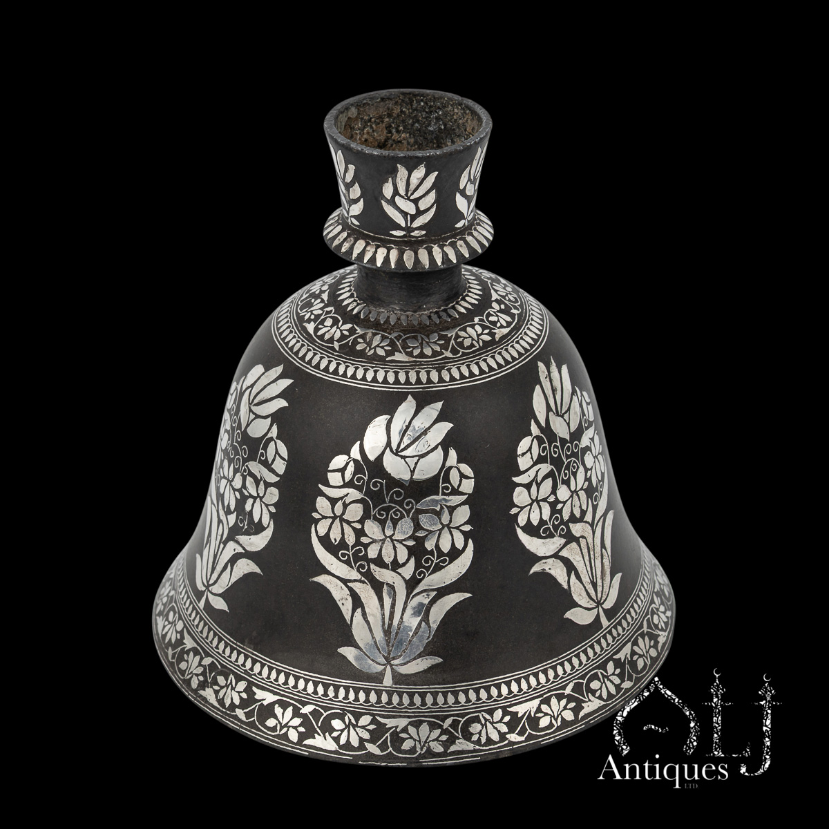 A masterful example of Deccani Bidri inlaid metalwork, this huqqa base stands as both an object of exceptional aesthetic refinement and as a document of the cosmopolitan tastes circulating between Mughal and Deccan courts during the early modern period.