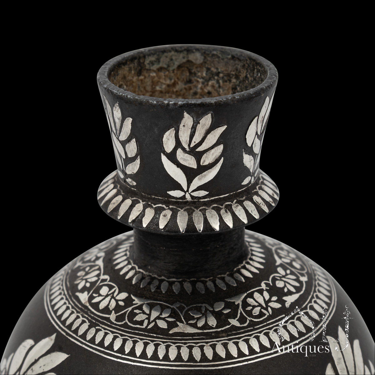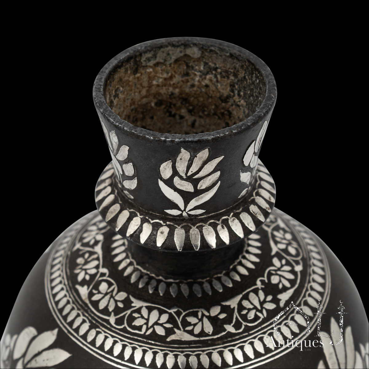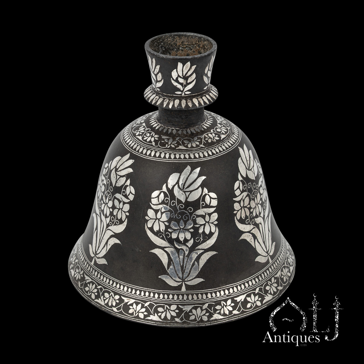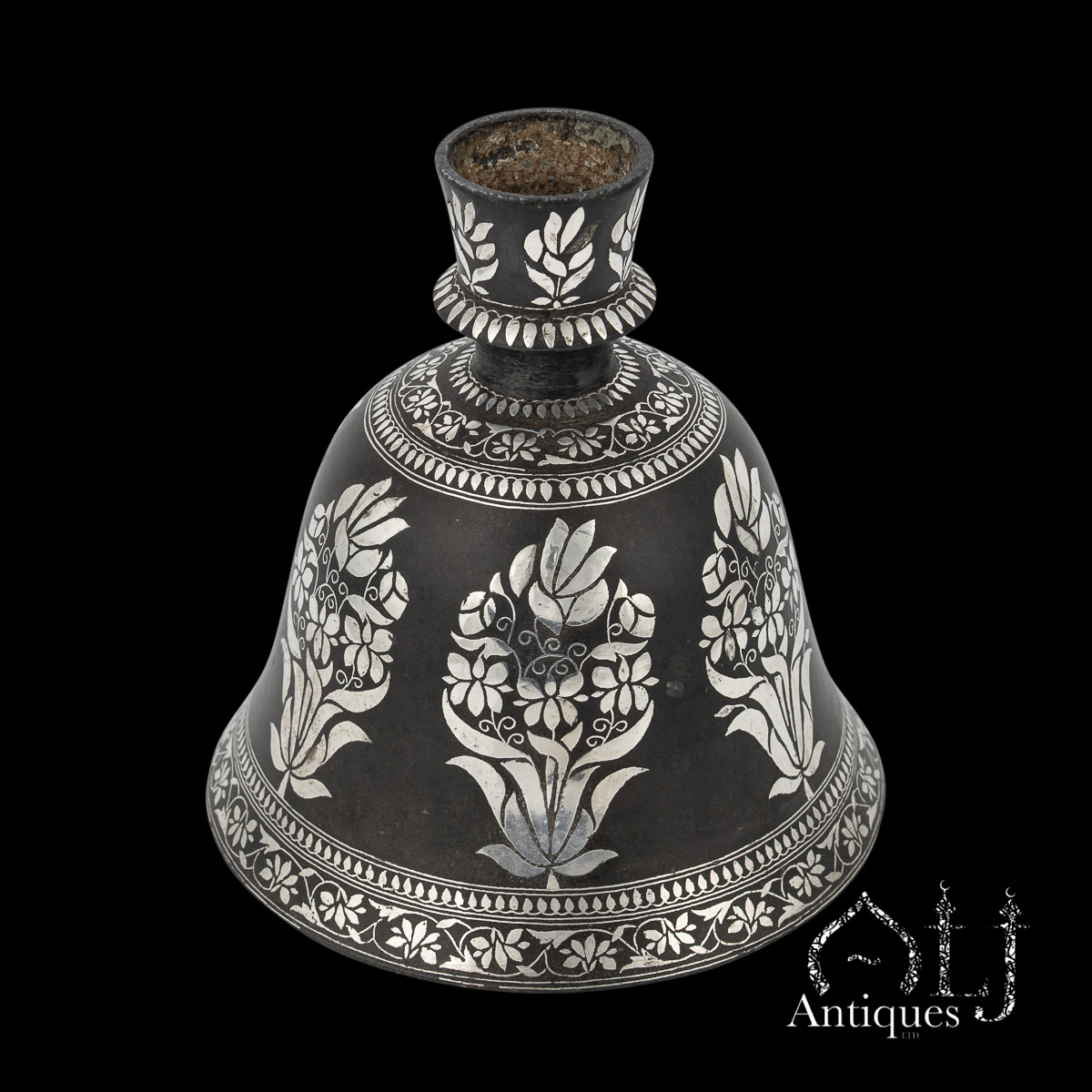 The artistic language of this huqqa base reflects the dynamic visual dialogue between the imperial Mughal aesthetic and older Deccani decorative traditions. Its striking contrast—bright silver floral motifs set against a deep, jet-black ground—embodies the essence of Bidri metalwork. Comparable visual solutions appear on a Hyderabadi bell-shaped huqqa base in the Ashmolean Museum, Oxford, attributed to the second half of the 18th century, and on another bell-shaped example in the Krishna Riboud Collection, published in Zebrowski, also, please see other related examples: (pp. 236–237, cat. nos. 395, 398 & 399). A closely related brass-inlaid, globular huqqa base in the Metropolitan Museum of Art, New York (inv. 1984.221), dated to the late 17th century, demonstrates the continuity and evolution of this decorative vocabulary across regions and materials.