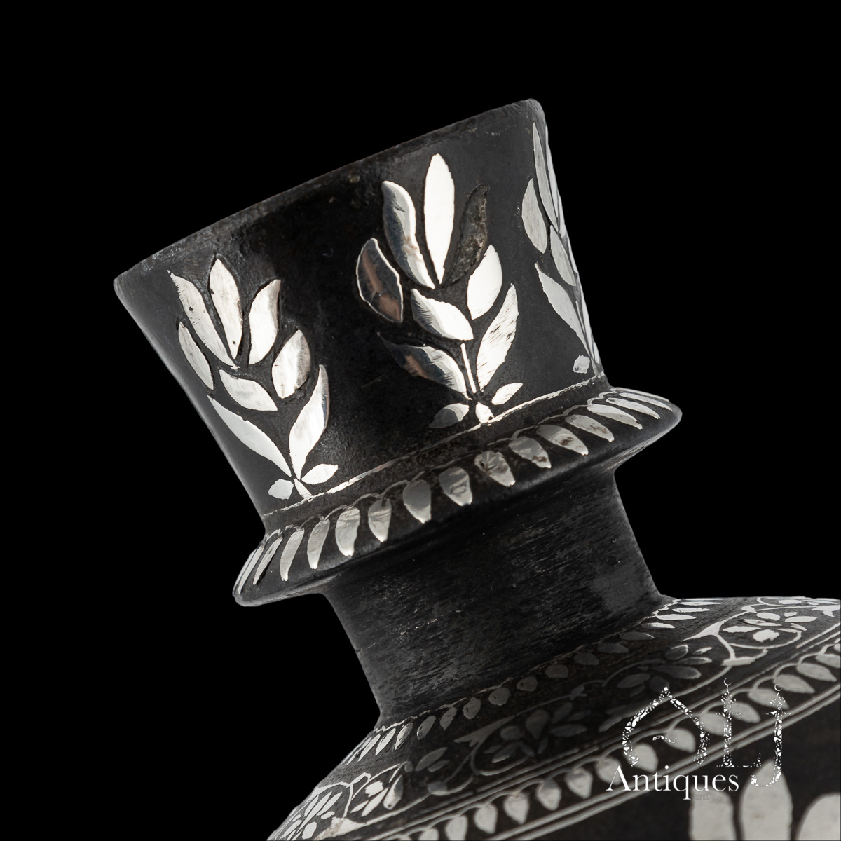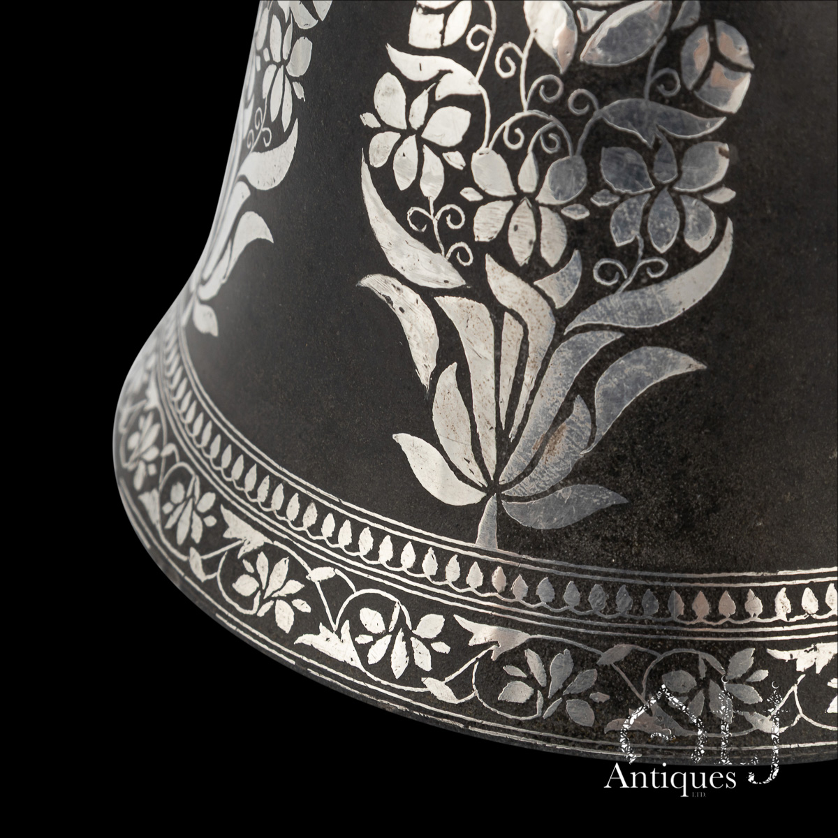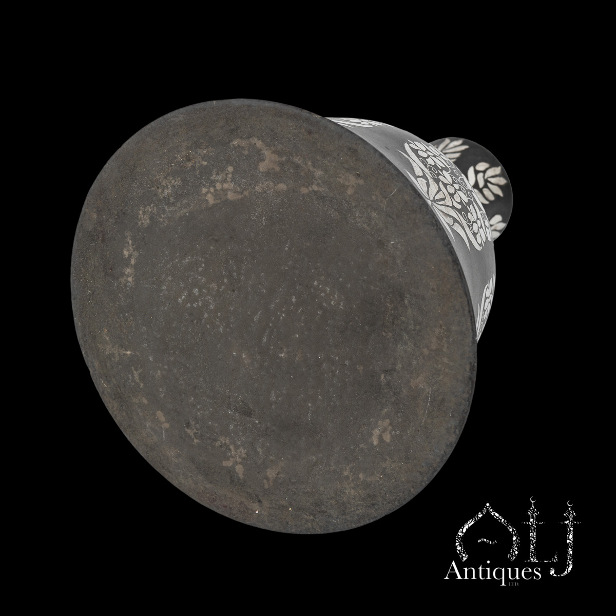 This refined huqqa or Hookah base, with a flaring bell-shaped body rising to a slightly concave waist and a short cylindrical neck with an everted rim, is crafted from a blackened zinc alloy and richly inlaid with silver sheets. Produced in the renowned Bidri workshops of Bidar—once a major artistic centre of the Deccan Sultanates—it likely dates to the middle decades of the 18th century. According to Mark Zebrowski, bell-shaped huqqa bases first appeared between 1730 and 1740, becoming progressively more desirable toward the latter half of the century (Zebrowski, Gold, Silver & Bronze from Mughal India, 1997, p. 236).