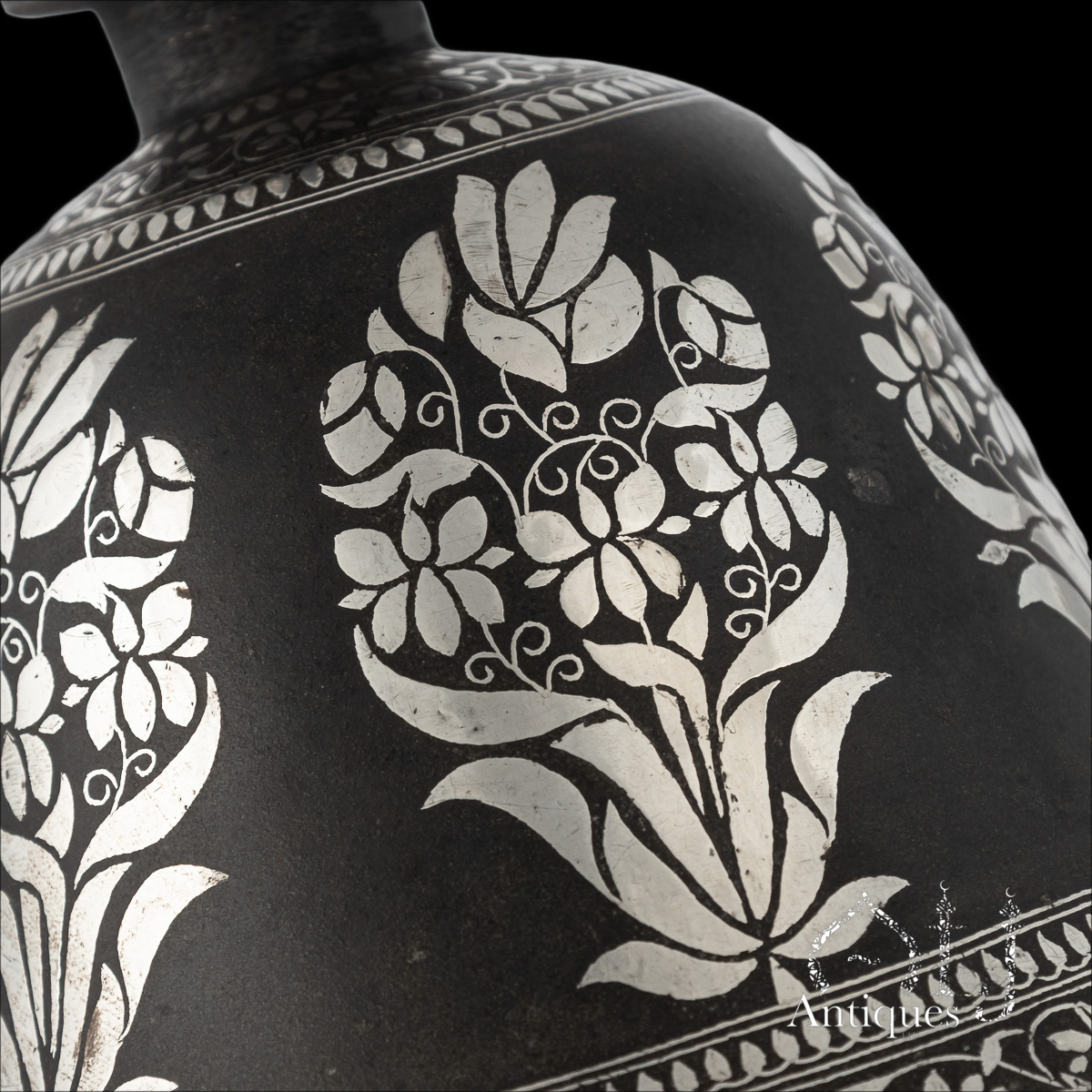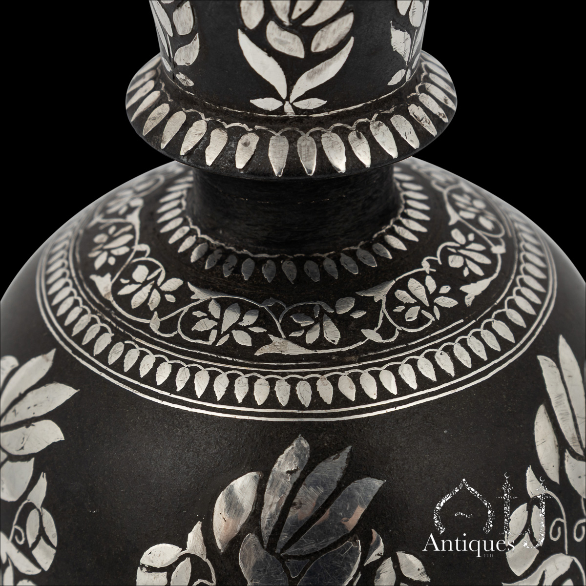 The vessel displays an elegant, architecturally harmonious silhouette. Its dense silver inlay is organised with almost sculptural precision and reflects the mid-18th-century Mughal courtly taste for stylised naturalism. The main decorative register on the body features exquisitely rendered upright bouquets composed of Mughal-style poppies, lotus blossoms, and hyacinths rising from long, fleshy leaves. The shoulders and base are adorned with overlapping friezes of drop-shaped motifs and lotus sprays, while the neck carries individually placed floral blossoms arranged with rhythmic, jewel-like regularity.