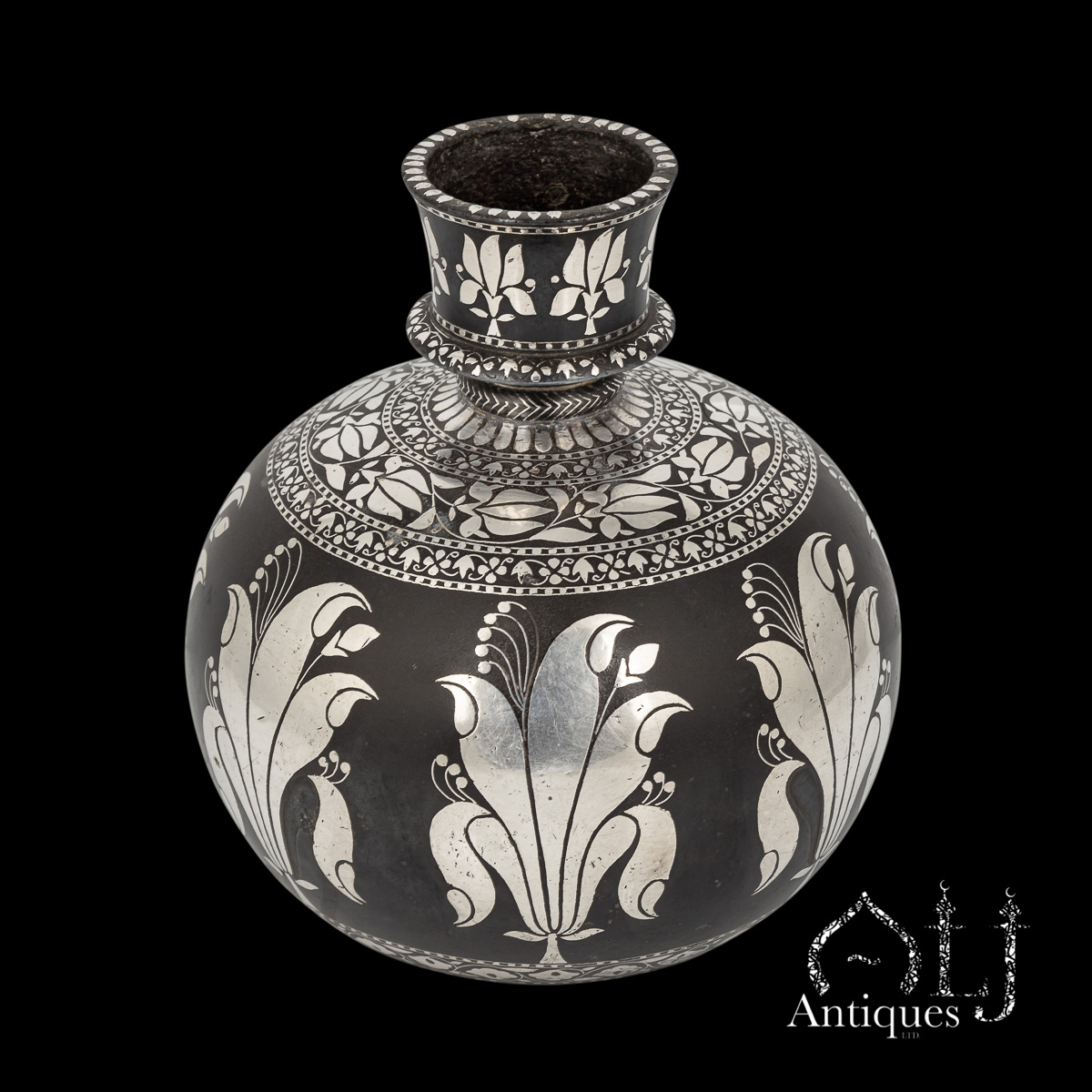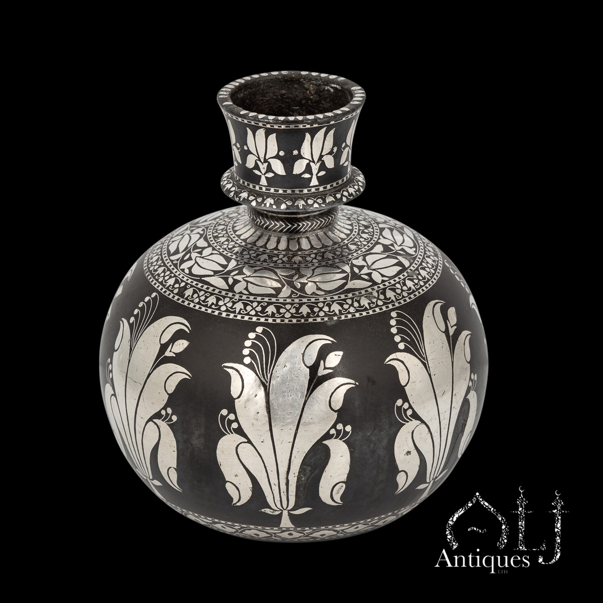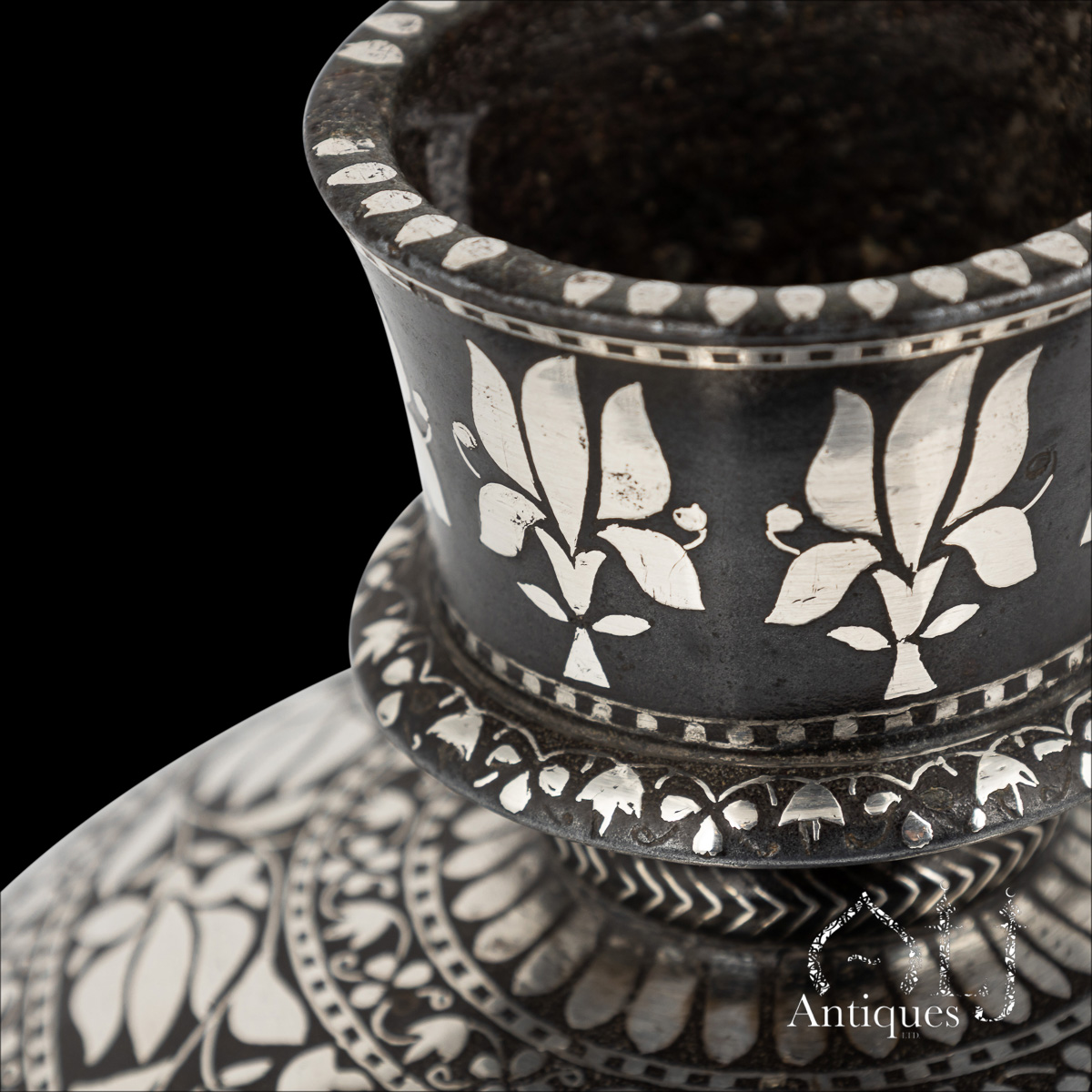 This elegant huqqa (hookah) base, characterised by a globular body, a ringed shaft, and a flared cylindrical neck with an everted rim, is crafted from the characteristic blackened zinc alloy of Bidar (bidri) and richly inlaid with silver using both tarkāshi (wire inlay) and tehnīshān (sheet inlay) techniques. The surface is articulated with a rhythmic programme of Mughal-inspired floral motifs in highly stylised form.