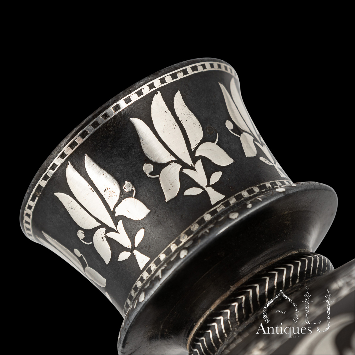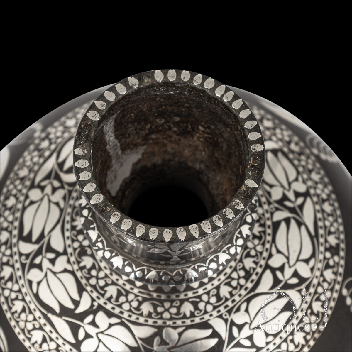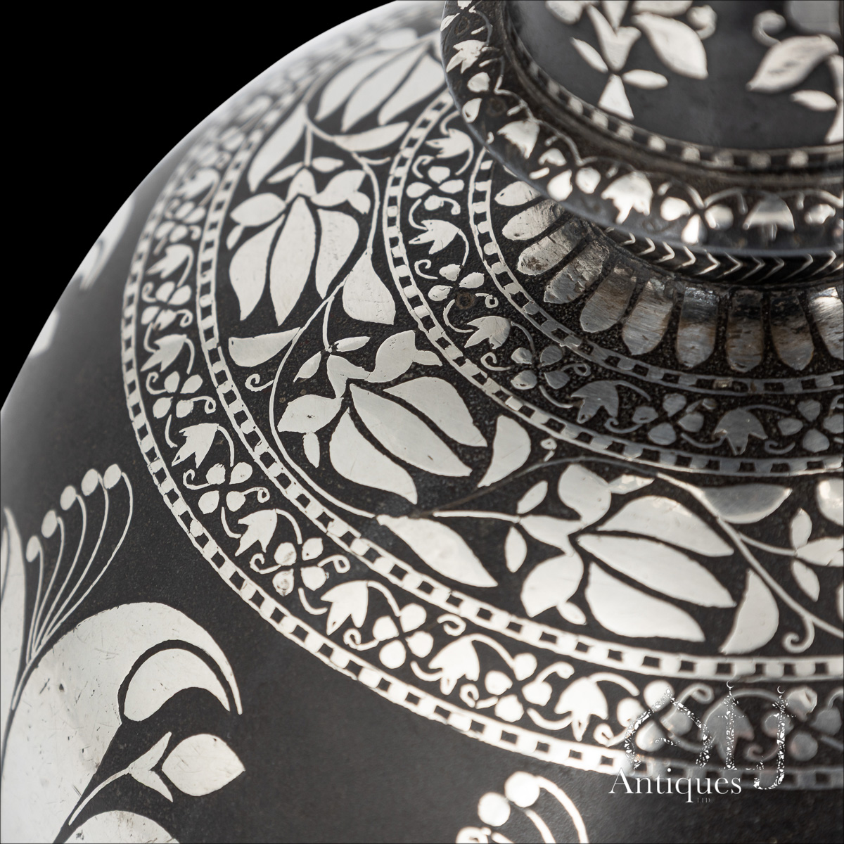 This elegant huqqa (hookah) base, characterised by a globular body, a ringed shaft, and a flared cylindrical neck with an everted rim, is crafted from the characteristic blackened zinc alloy of Bidar (bidri) and richly inlaid with silver using both tarkāshi (wire inlay) and tehnīshān (sheet inlay) techniques. The surface is articulated with a rhythmic programme of Mughal-inspired floral motifs in highly stylised form.