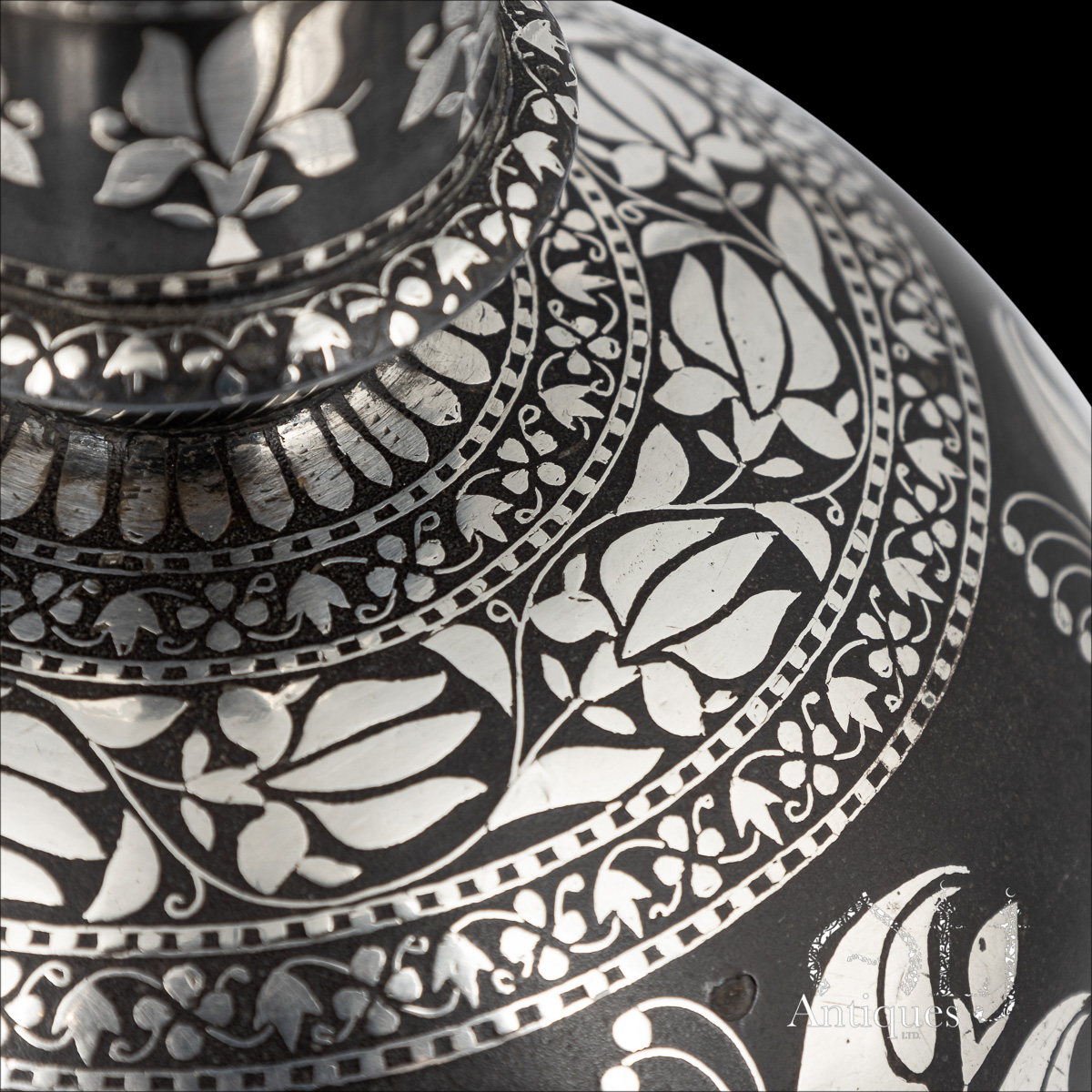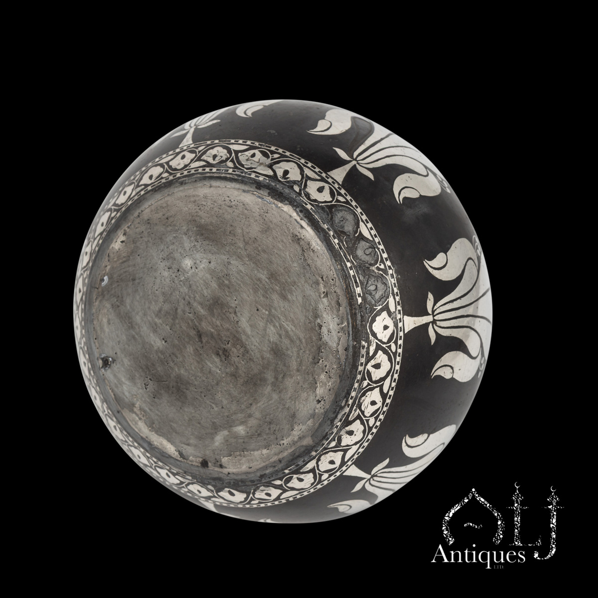 The shoulders present alternating ornamental registers containing scrolling tendrils, stylised lotus petals, and floral sprays, repeated around the lower base as well. The entire composition embodies a well-balanced synthesis of the refined Mughal–Deccani aesthetic favoured in Bidri metalwork from the late 17th to the mid-18th century (Marika Sardar, in Maryam Ekhtiar, Priscilla P. Soucek, Sheila R. Canby, and Navina Haidar, eds., Masterpieces from the Department of Islamic Art in The Metropolitan Museum of Art, 2011, pp. 385–86, cat. nos. 273 and 274).