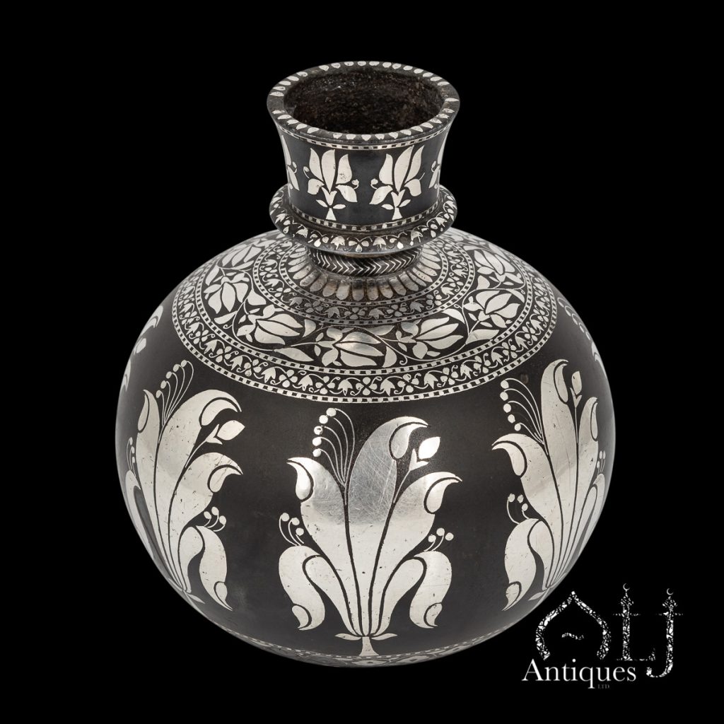 This elegant huqqa (hookah) base, characterised by a globular body, a ringed shaft, and a flared cylindrical neck with an everted rim, is crafted from the characteristic blackened zinc alloy of Bidar (bidri) and richly inlaid with silver using both tarkāshi (wire inlay) and tehnīshān (sheet inlay) techniques. The surface is articulated with a rhythmic programme of Mughal-inspired floral motifs in highly stylised form.