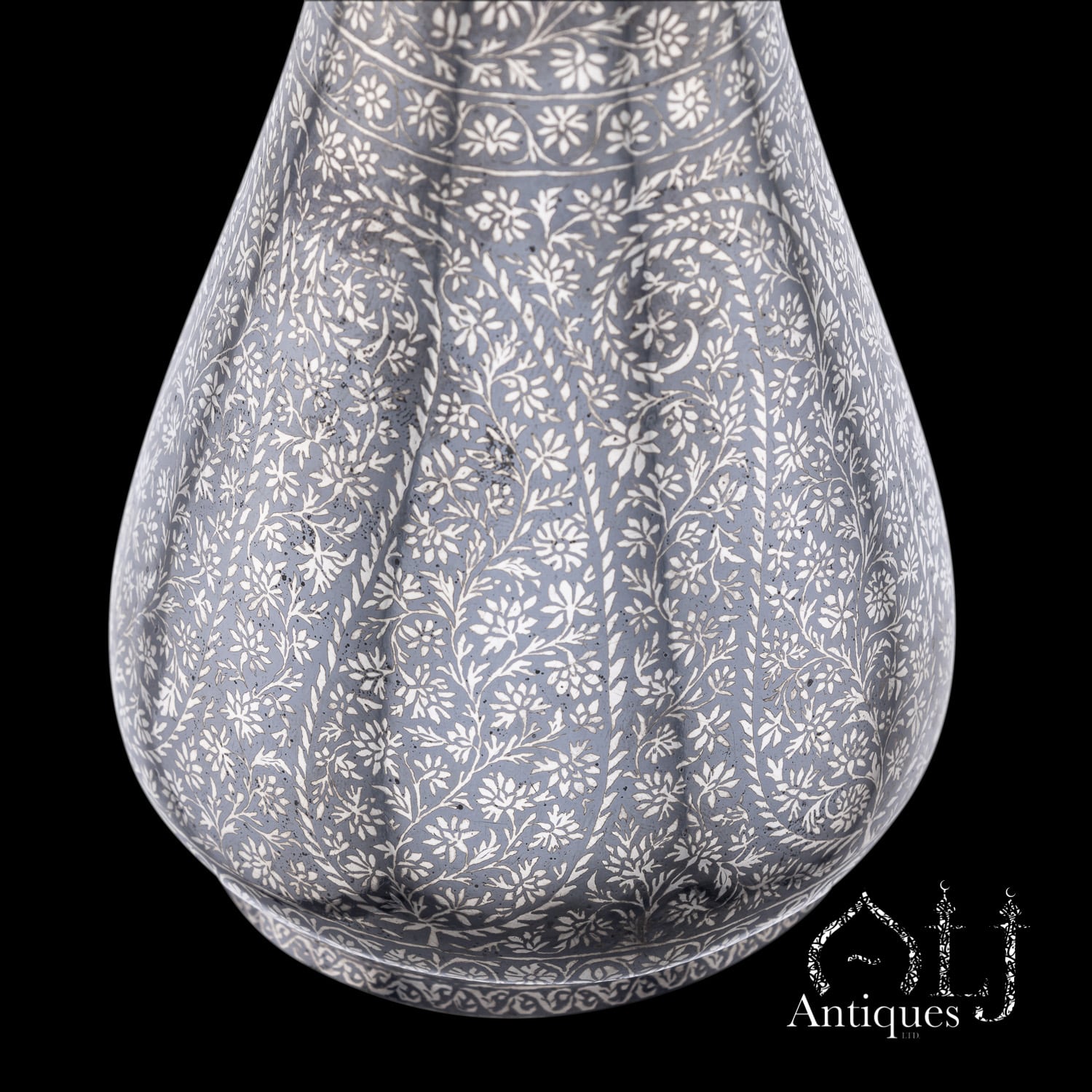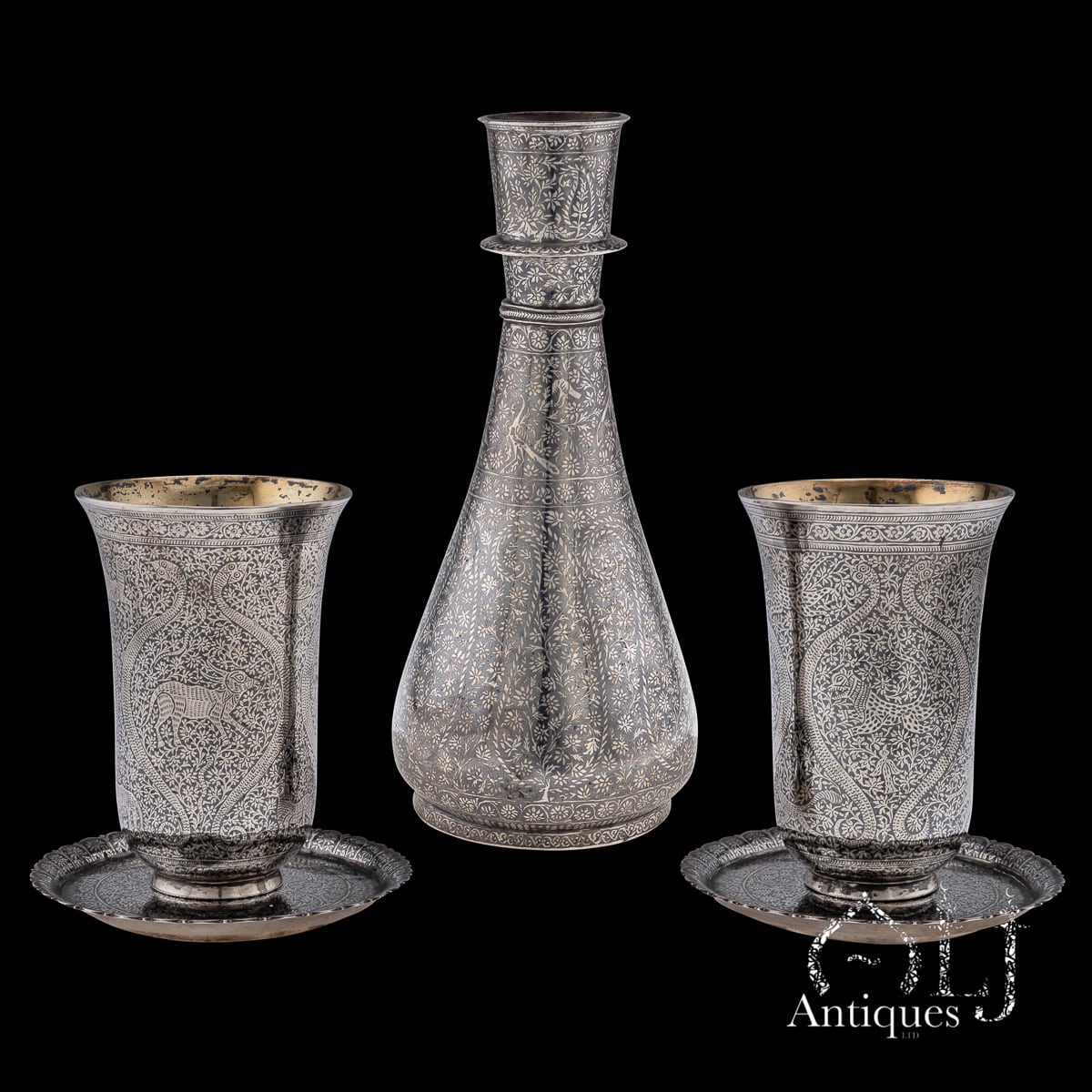 Antique Indian nielloed silverware is exceptionally rare, with only a small number of surviving examples. For this reason, the technique is often described as a “lost” art of Indian silver nielloware. Production ceased at an unknown date, and the precise locations of manufacture remain uncertain, especially when compared with other inlaid metal techniques such as durable champlevé and opaque enamelling, or more fragile decorative materials like lac. As a result, the present ensemble raises important questions regarding its precise origin.