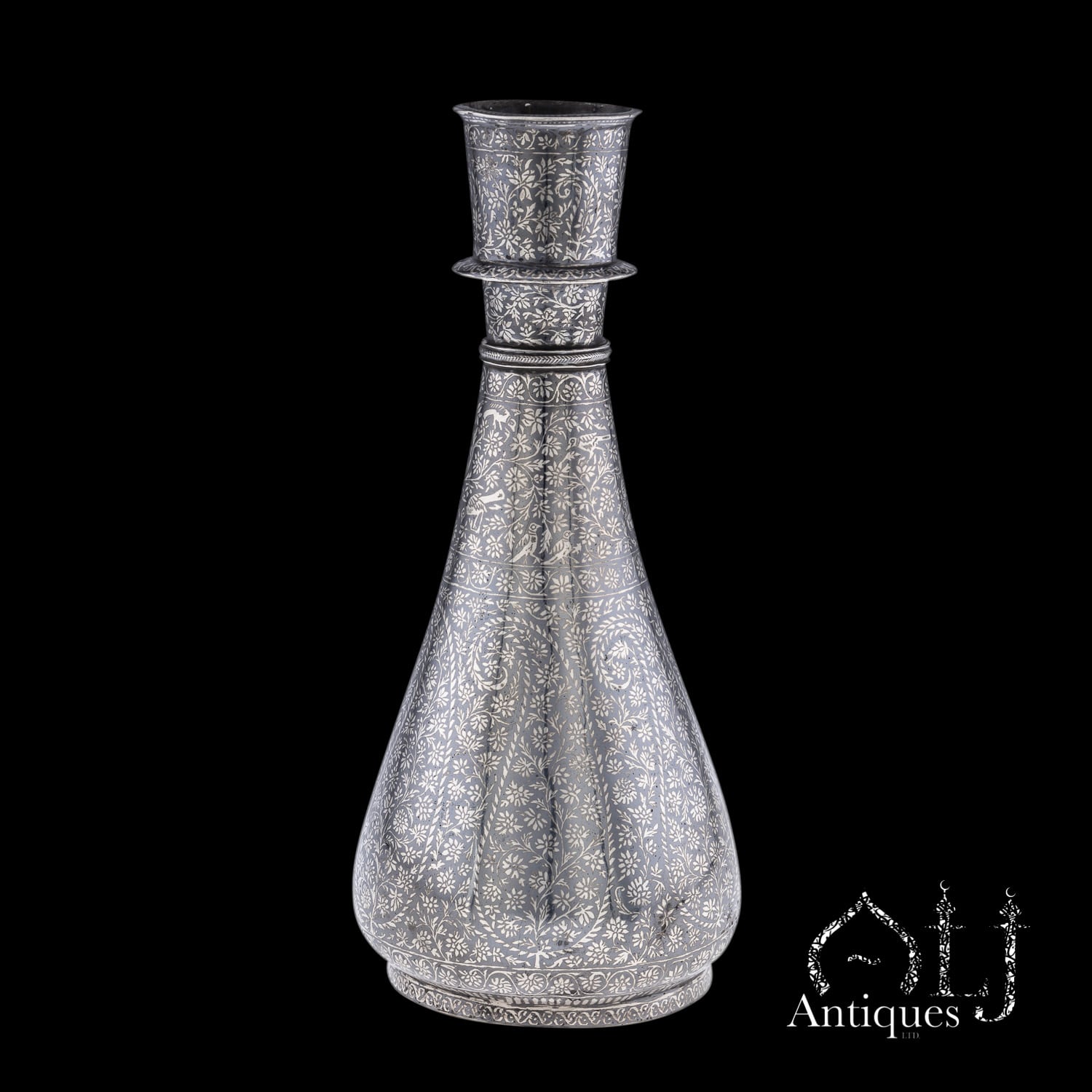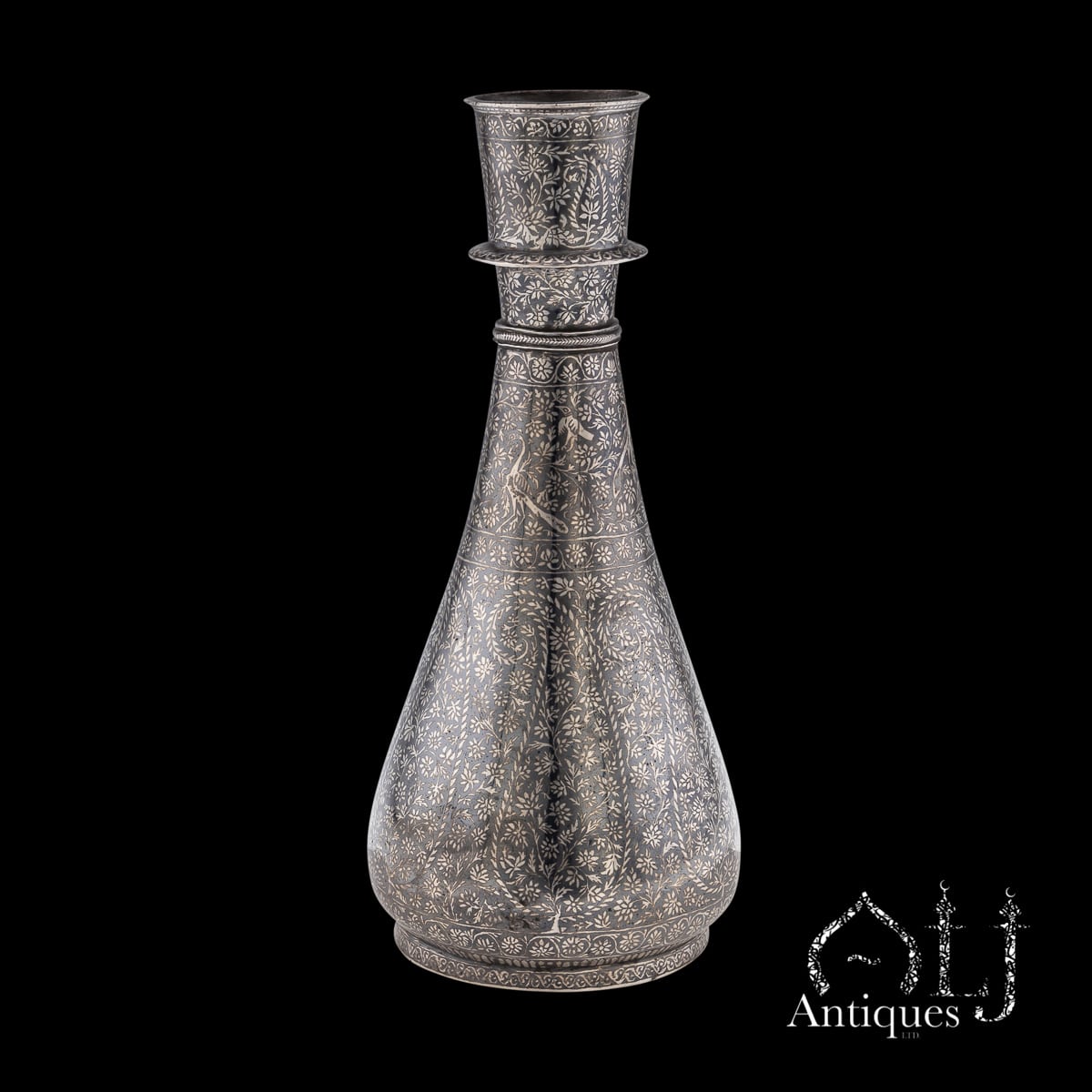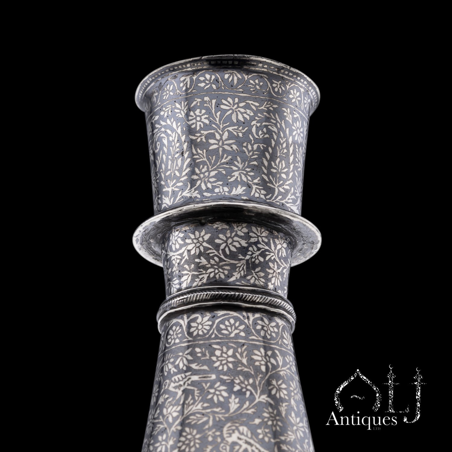 The huqqa base displays an elegant, tapering silhouette rising to a double-ringed neck and flaring mouth. Remarkably, its entire surface—including the upper rim of the mouth, the neck rings, the joints, and the rounded base—is densely engraved and worked with vegetal and animal motifs set against a deep black niello ground. The lower frieze features a continuous band of paisley (boteh) leaves, a motif commonly associated with Kashmiri artworks, infilled with delicate floral sprays, meandering tendrils, and interlacing palmettes.