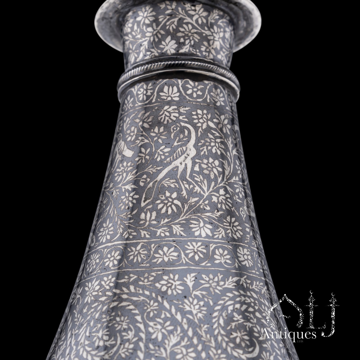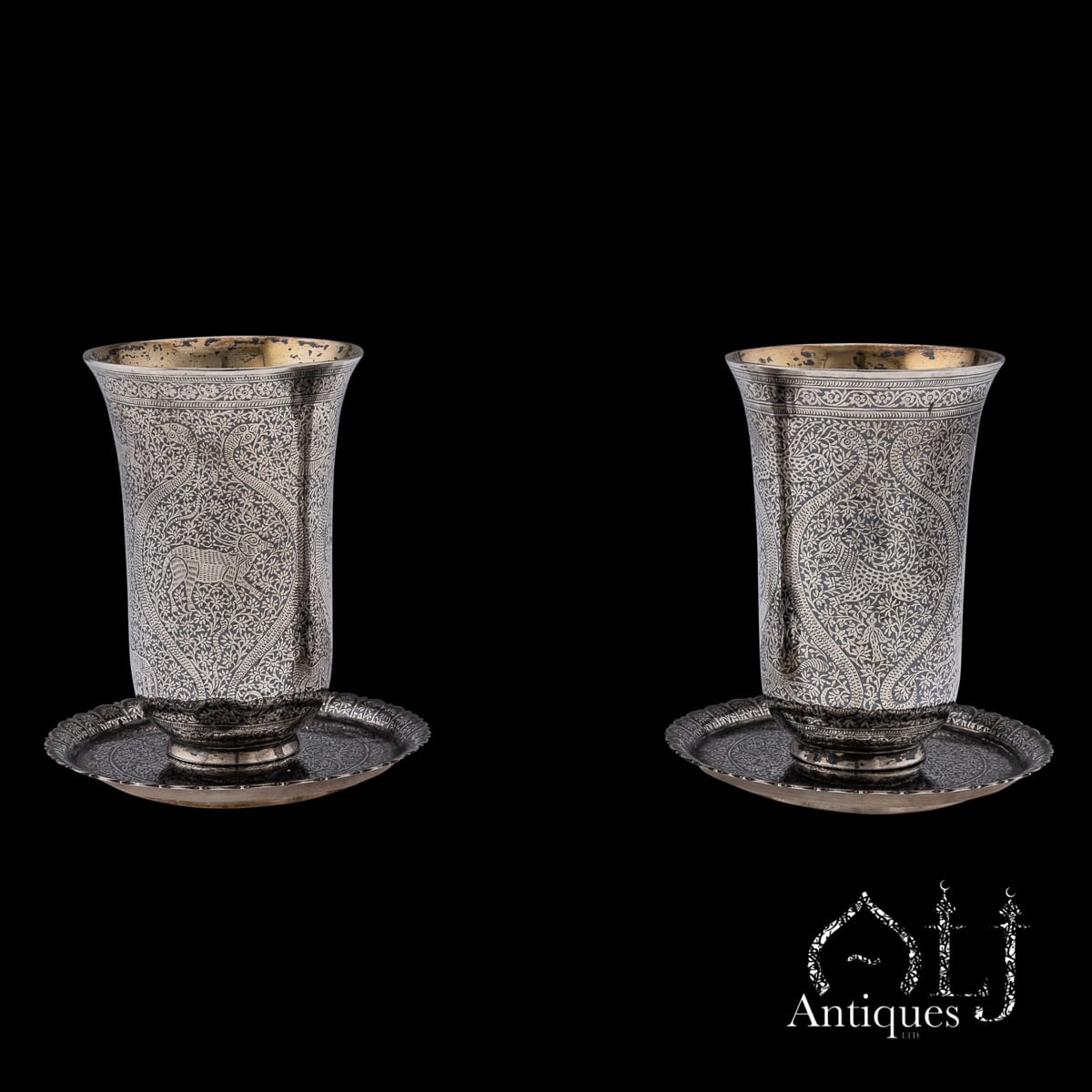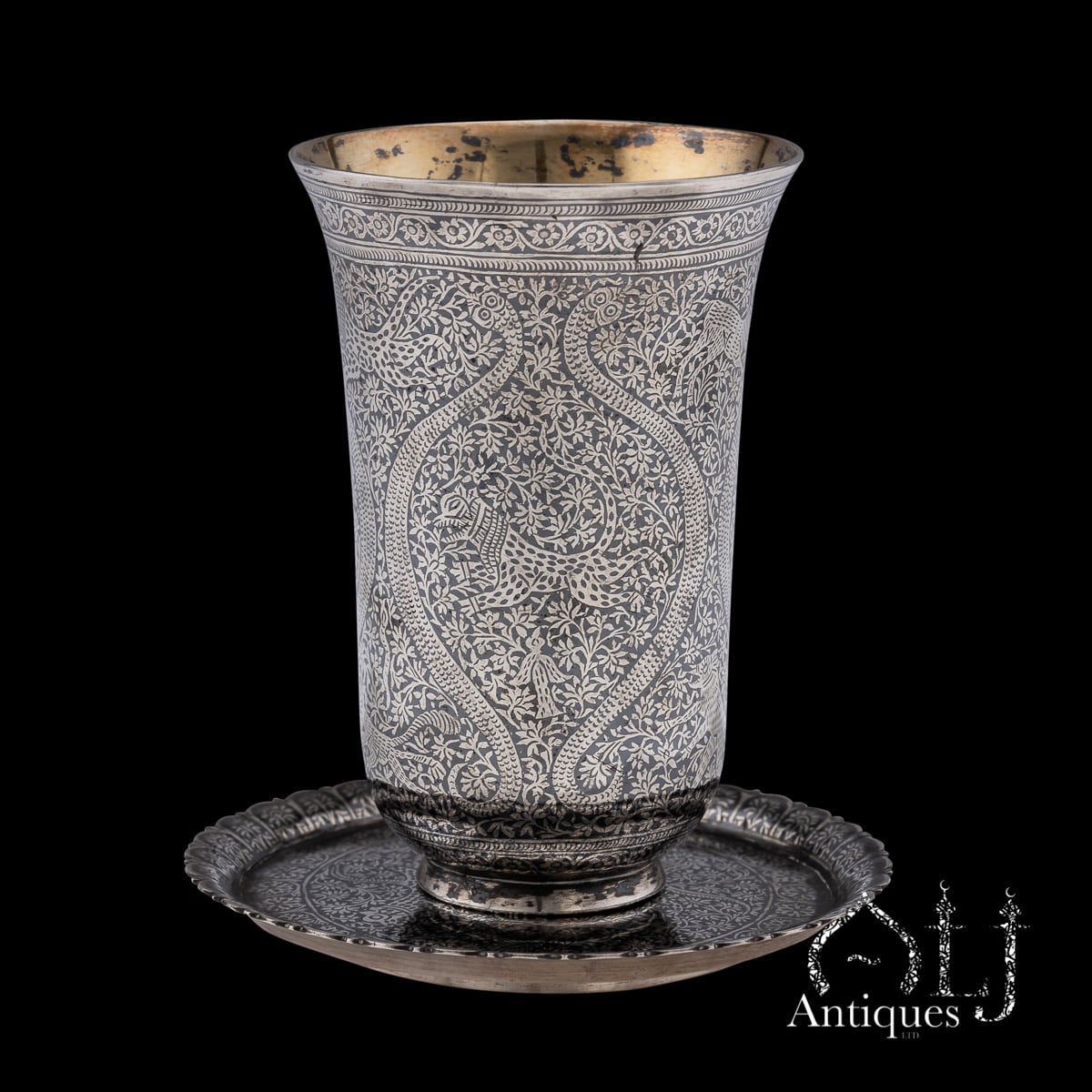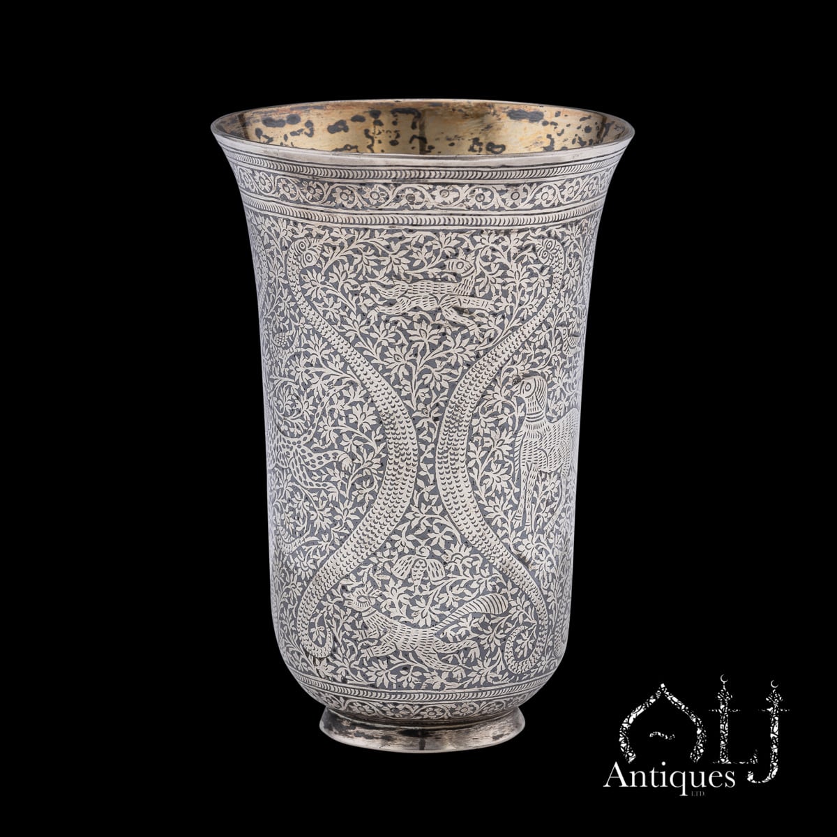 The beakers shape and certain decorative features bear resemblance to Kashmiri metalwork, which typically emphasises floral and geometric ornamentation. At the same time, the vitality of the animal scenes and the intricacy of the vegetal scrollwork are also reminiscent of Lucknow or Awadhi works in precious and semi-precious metals. Nevertheless, the overall stylistic coherence and vessel forms strongly echo Bidri silver-inlaid zinc wares. The affinity with Bidri production, combined with the unconventional use of pure silver niello, supports an attribution to the Deccan Sultanates—specifically Hyderabad or Golconda—where craftsmen were known to adapt Bidri idioms into luxurious forms intended for elite patrons.