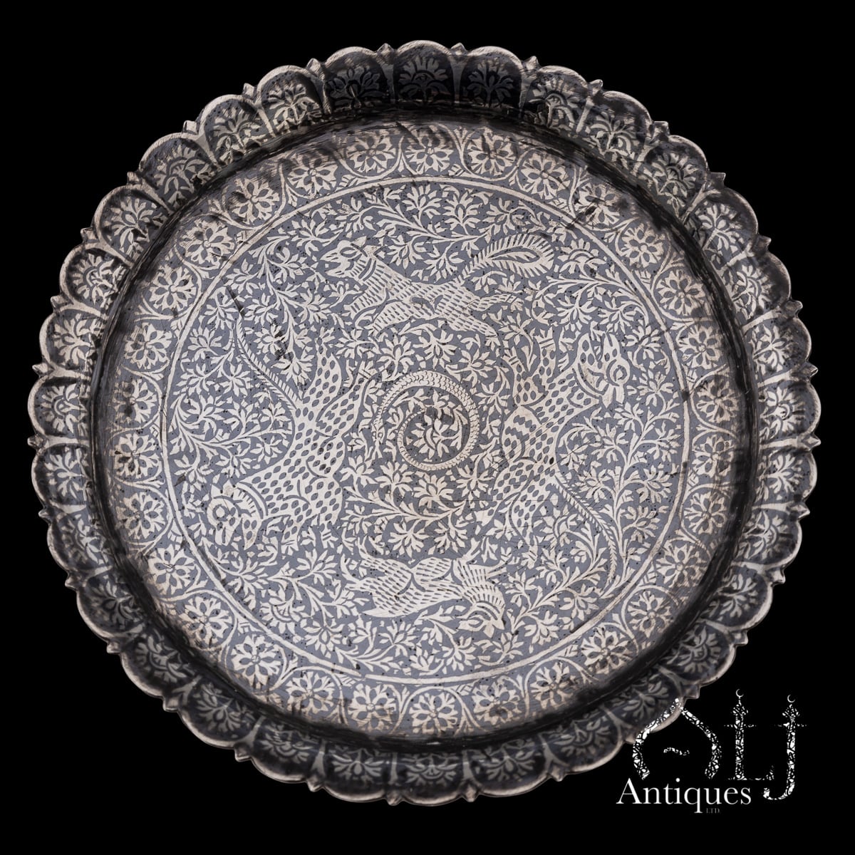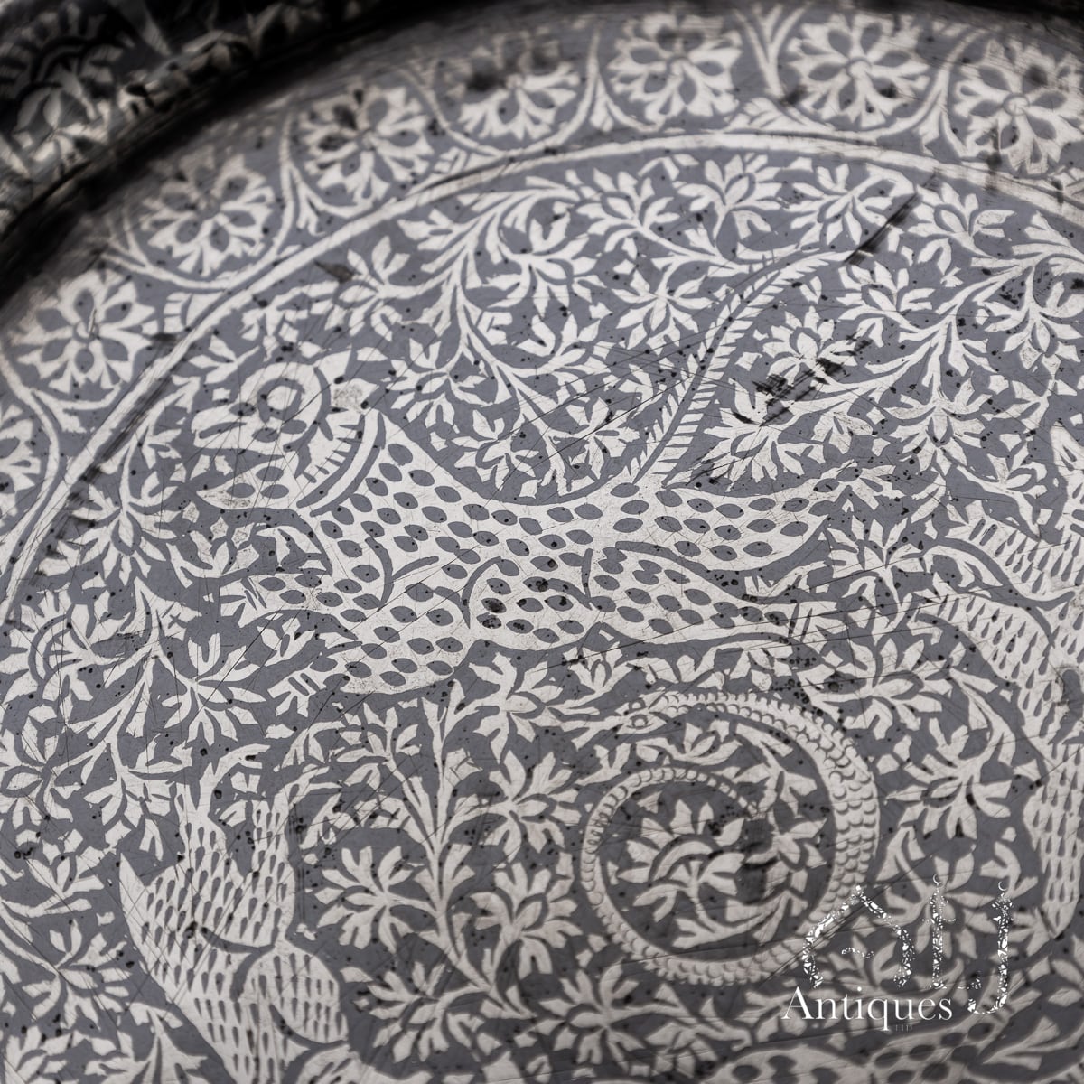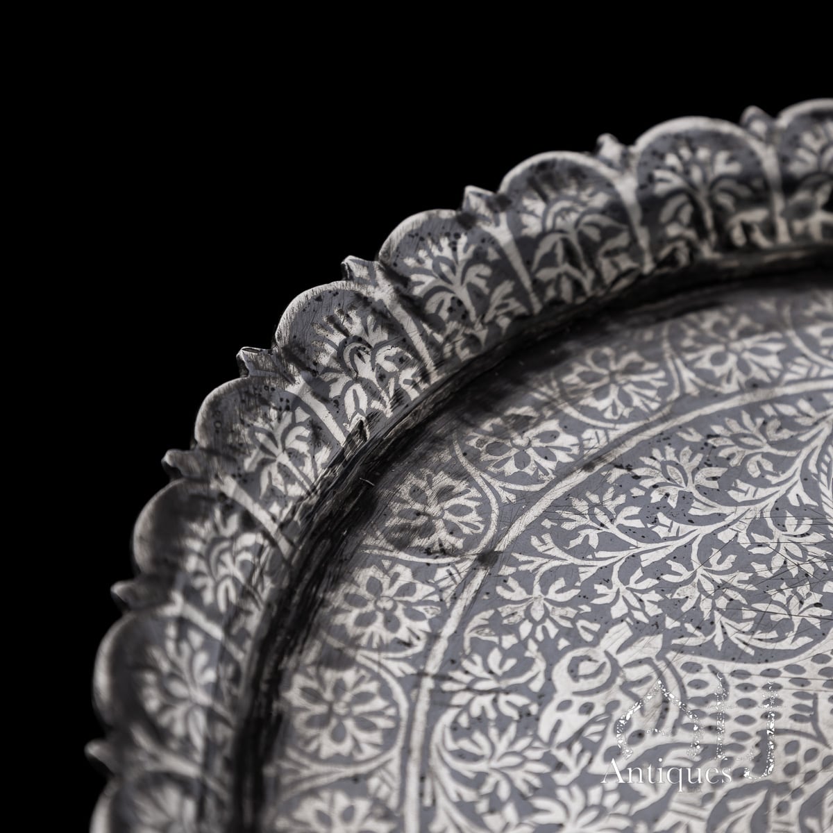 The accompanying circular trays feature scalloped rims and radiating registers of floral motifs arranged around central animal medallions, again depicting hunting scenes with tigers and possibly hyenas pursuing a deer. These compositions recall Bidri trays (thali) produced in Bidar, Deccan, during the 17th century (see Mark Zebrowski, Gold, Silver & Bronze from Mughal India, 1997, cat. nos. 422, 428, and 441). The striking contrast between the shimmering silver surface and the dark niello ground strongly aligns this group with Bidriware aesthetics, though here executed entirely in silver, creating a luxurious reinterpretation of a celebrated Deccani decorative idiom.