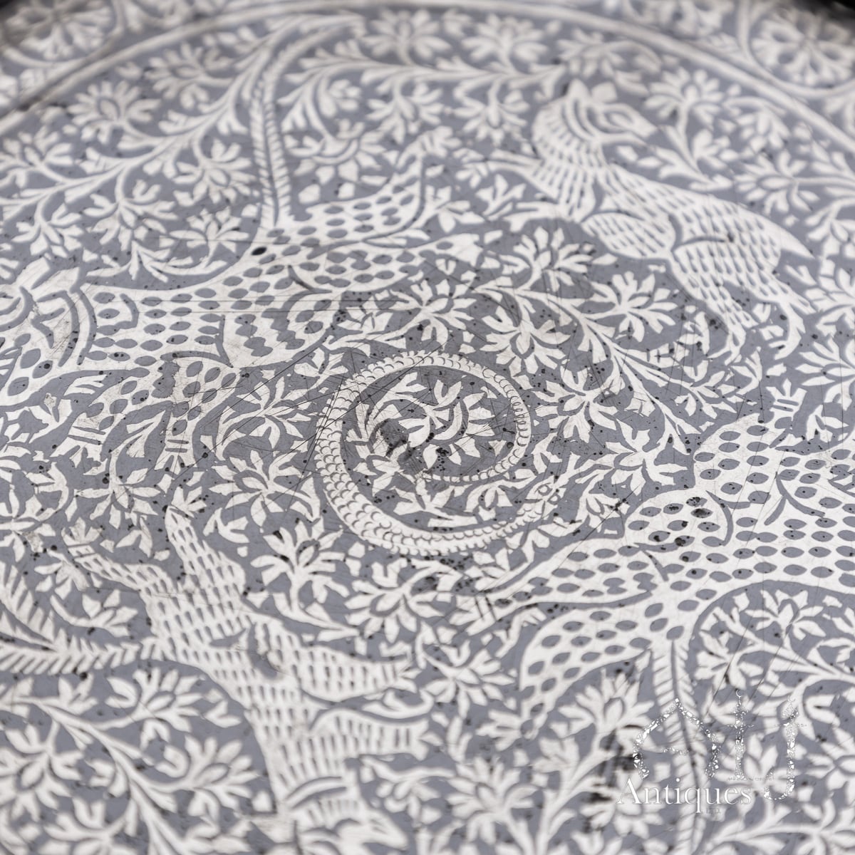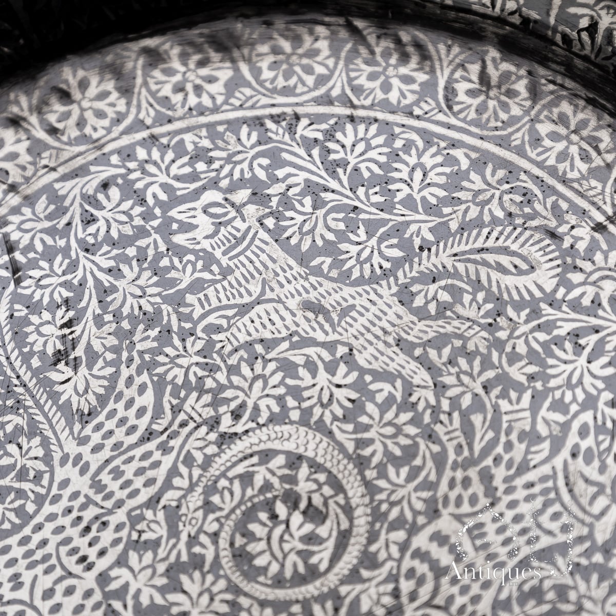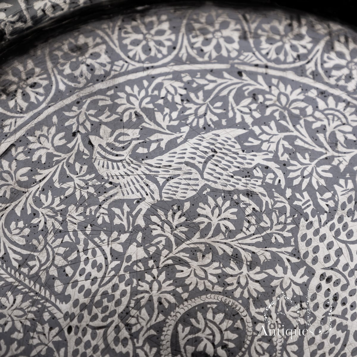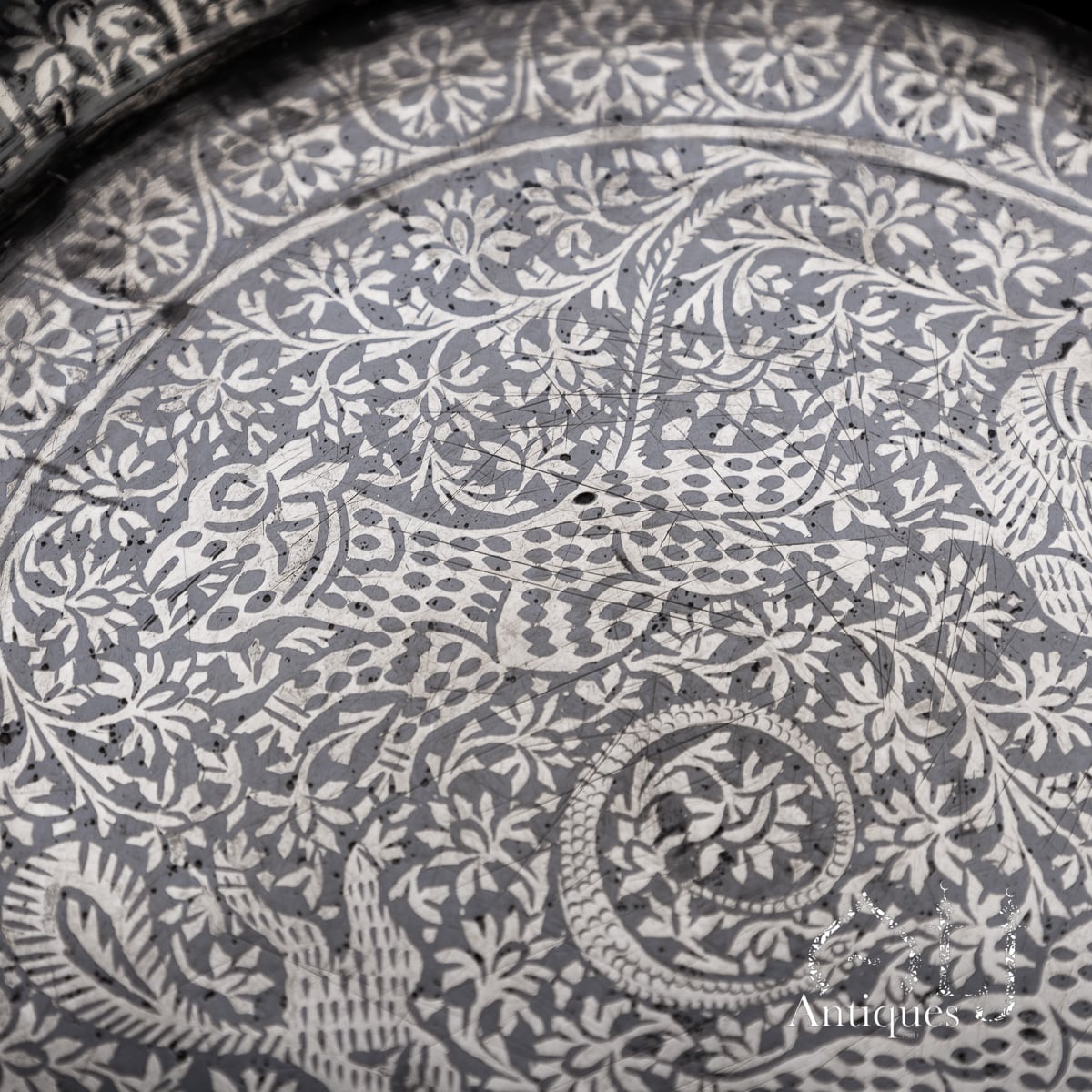 The accompanying circular trays feature scalloped rims and radiating registers of floral motifs arranged around central animal medallions, again depicting hunting scenes with tigers and possibly hyenas pursuing a deer. These compositions recall Bidri trays (thali) produced in Bidar, Deccan, during the 17th century (see Mark Zebrowski, Gold, Silver & Bronze from Mughal India, 1997, cat. nos. 422, 428, and 441). The striking contrast between the shimmering silver surface and the dark niello ground strongly aligns this group with Bidriware aesthetics, though here executed entirely in silver, creating a luxurious reinterpretation of a celebrated Deccani decorative idiom.
