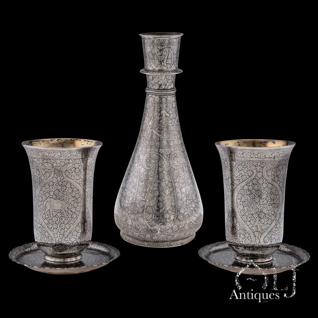 Antique Indian nielloed silverware is exceptionally rare, with only a small number of surviving examples. For this reason, the technique is often described as a “lost” art of Indian silver nielloware. Production ceased at an unknown date, and the precise locations of manufacture remain uncertain, especially when compared with other inlaid metal techniques such as durable champlevé and opaque enamelling, or more fragile decorative materials like lac. As a result, the present ensemble raises important questions regarding its precise origin.
