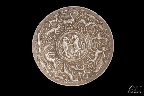 Of shallow rounded form with raised boss at centre, the surface is worked in extremely fine repoussé silver with a central animal combat scene comprising a lion fighting a bear in a floral background encircled by two garlands. The cavetto presents beasts, some parading and other in combat attitude, chasing each other around the rim. Within this composition it is possible to find hounds, rabbits, birds and snakes.