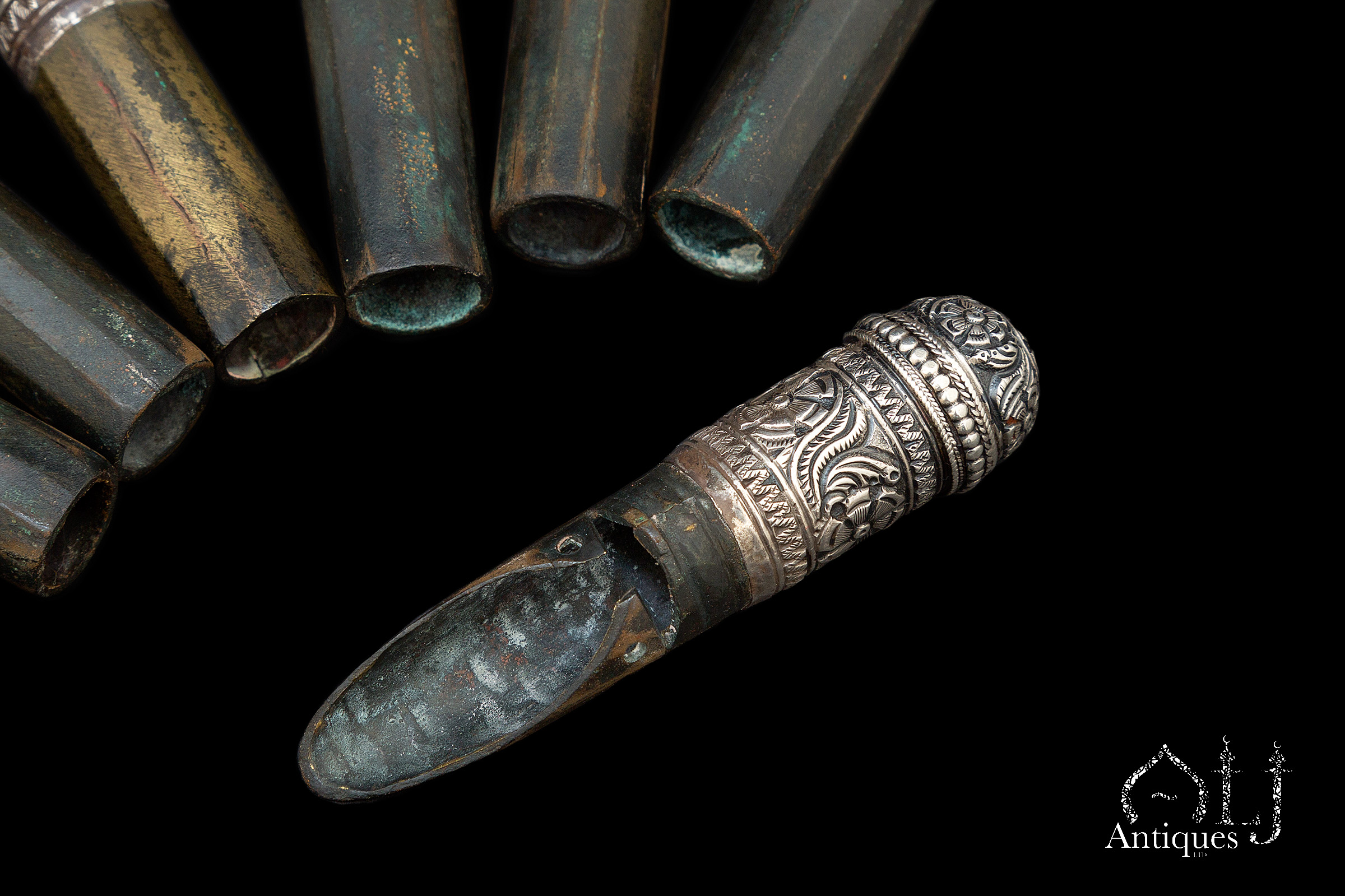 Ottoman Arms & Armour, A Very Rare Fine Silk & Silver-Thread Brocaded Leather Belt With 14 Individual Brass Compartments of Gunpowder Charges (Barutluk) or (Gazri) (حافظة بارود) and One Gunpowder Scoop Measurer Mounted with Repousse Silver Finials Beautifully Decorated with Floral Designs, The Ottoman Empire, Probably the Ottoman Provinces and Turkey, Circa 18th. Century.