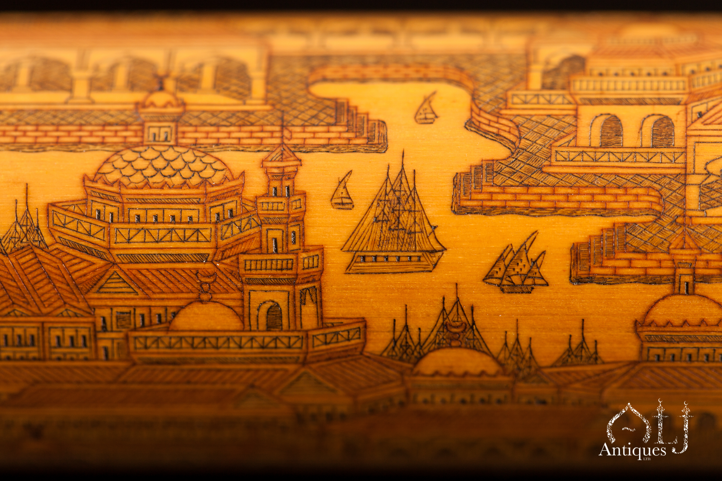 This rare piece was either made as document holder or as a scribal equipment container used for carrying brushes, reed pens and / or a roll of paper. The lot is of a cylindrical shape and consists of two pieces, each engraved, painted (with black and red on a beige ground), and lacquered with scenes depicting an imaginary view of a large Ottoman coastal city or harbour, most probably of the Ottoman capital, the city of Istanbul. These views usually depict various Ottoman buildings of Islamic style and architecture with clear crescents on top of domes and minarets, large mosques, waterways and ships including steam engine ships which started to be more common in the latter half of the 19th century and that proves that our present lot belongs to that era.