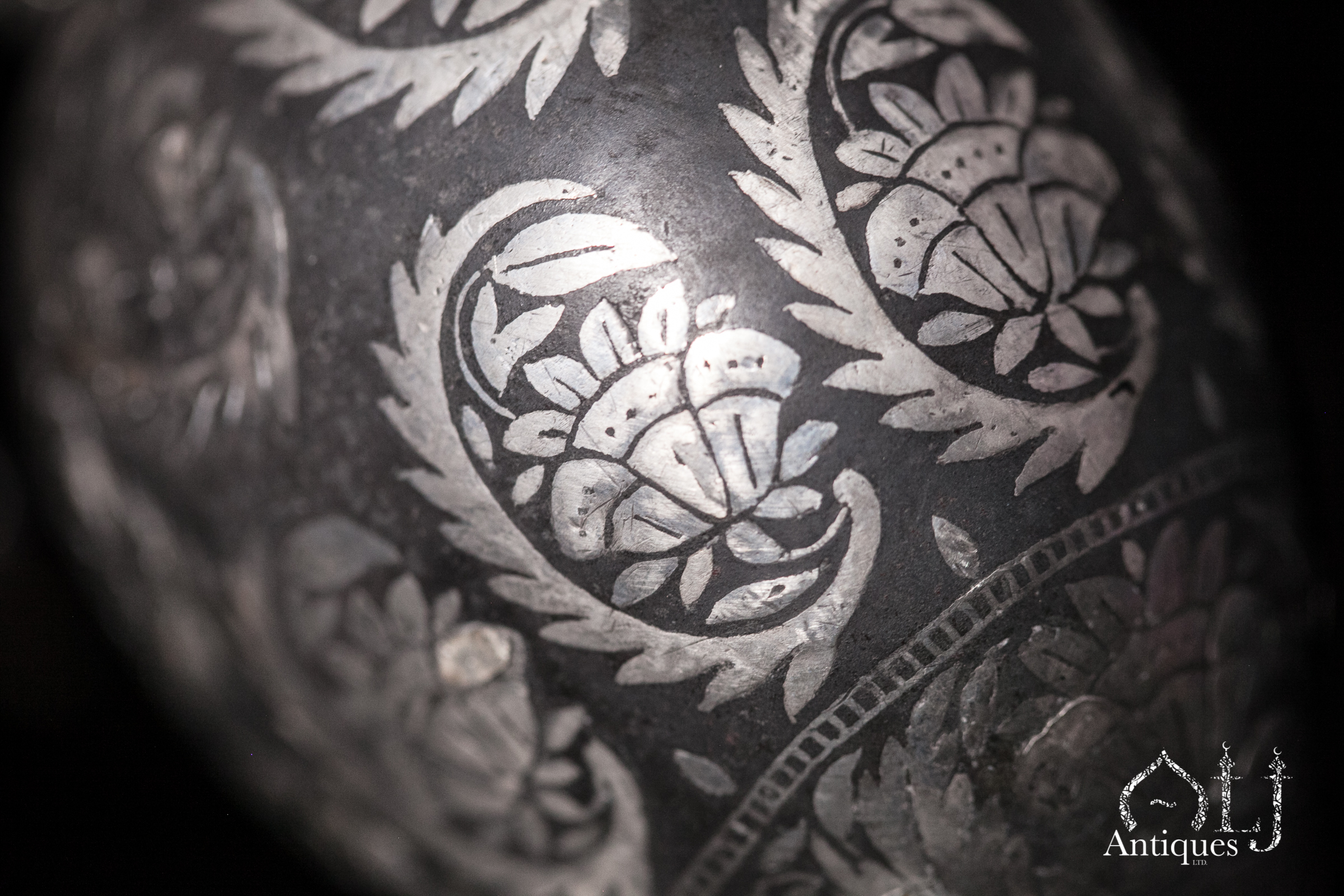 The body is cast in the form of a mango fruit, engraved and inlaid with silver, decorated with elaborate floral sprays, the neck and bottom are decorated with parallel pointed triangular shaped heads lines.