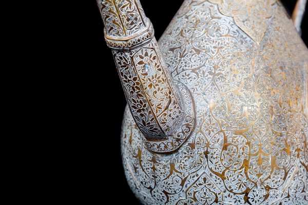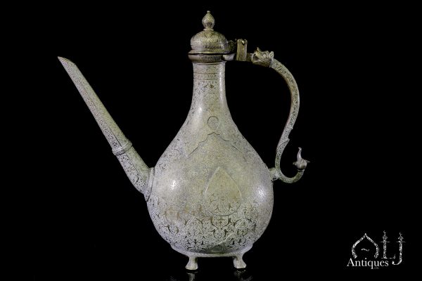 This magnificent cast pear-shaped with curved body ewer is carved with raised and confronted chevron or palmettes motives and a tear drop shape at the centre, the overall body is beautifully decorated and engraved with Rumi style arabesque motives, birds, floral designs and with Hindu influence decoration depicting the sun face or the Hindu Sun God of Lord Surya.