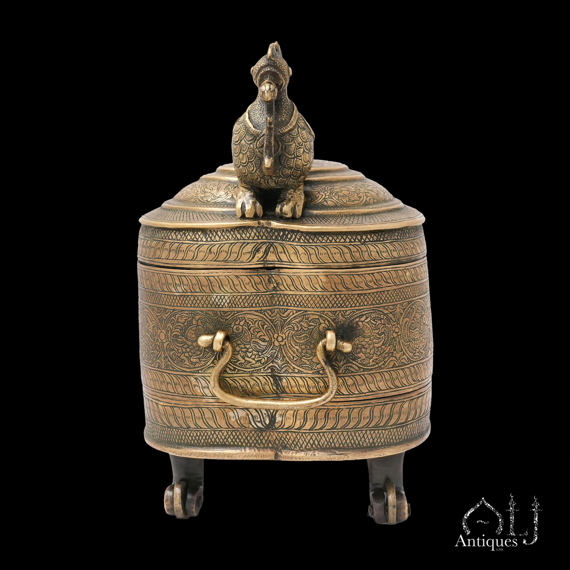 The lid is surmounted by a sculptural standing Hamsa bird, finely cast and detailed. This figure is not only decorative but functional: when the pandan is fully opened, the bird provides stabilising balance.
