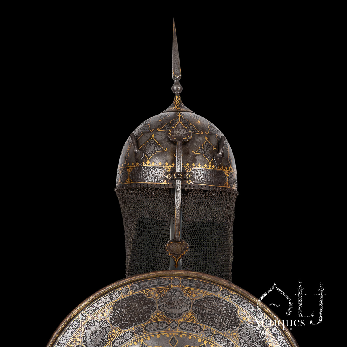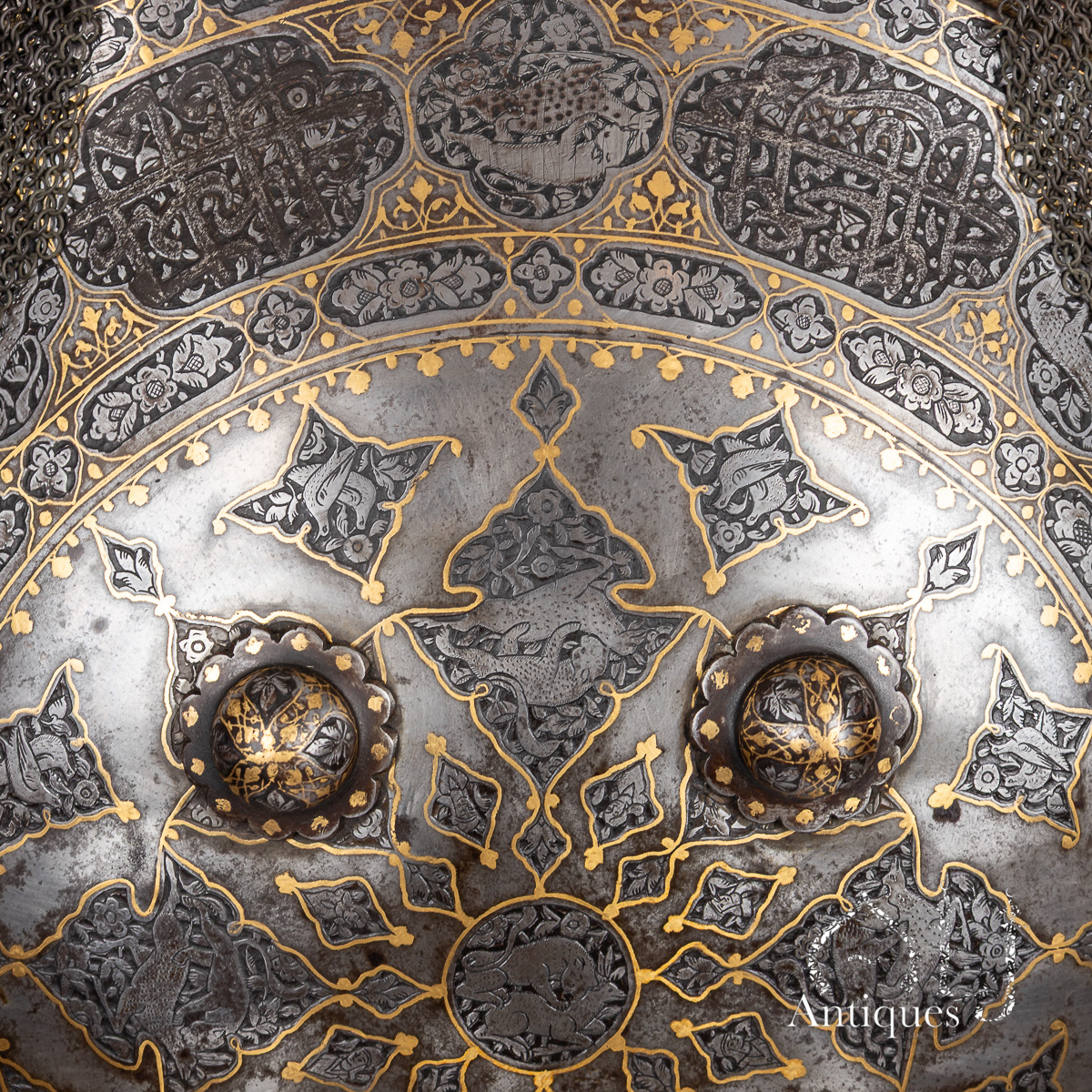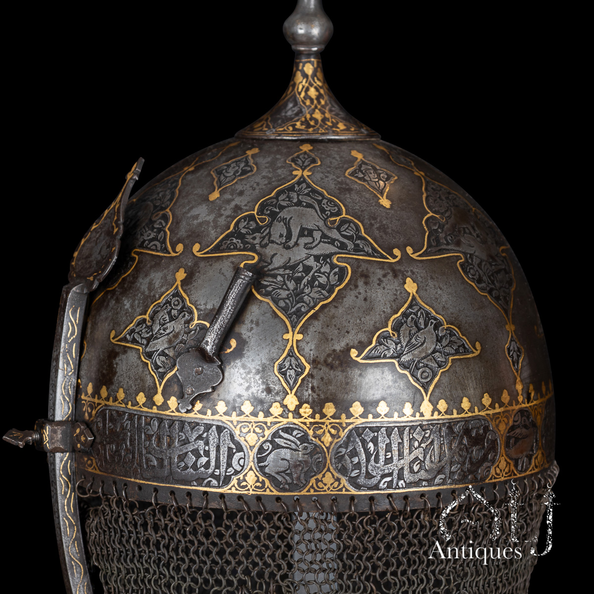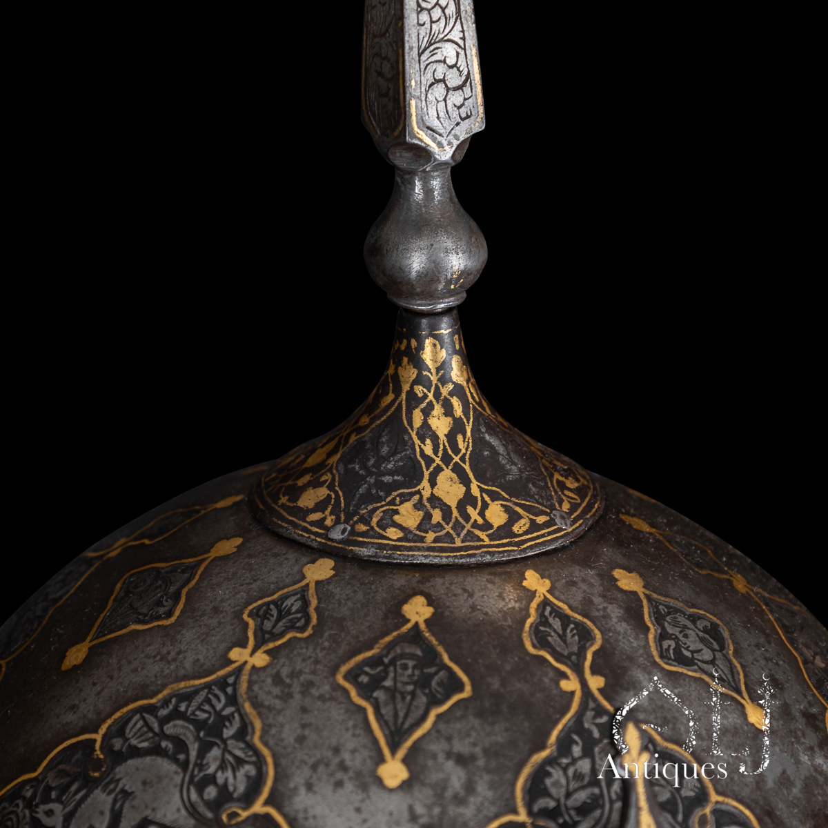 The helmet is of traditional domed form surmounted by a tall spike finial and fitted with a sliding nasal guard terminating in a palmette-shaped plaque. The helmet retains its original butted chainmail aventail, protecting the neck and shoulders. The steel surface is intricately engraved with medallions and cartouches depicting hunting animals and ornamental foliage, all highlighted with finely applied gold damascening.