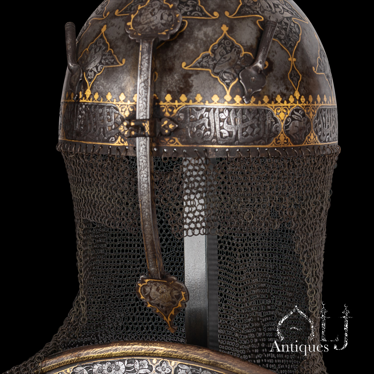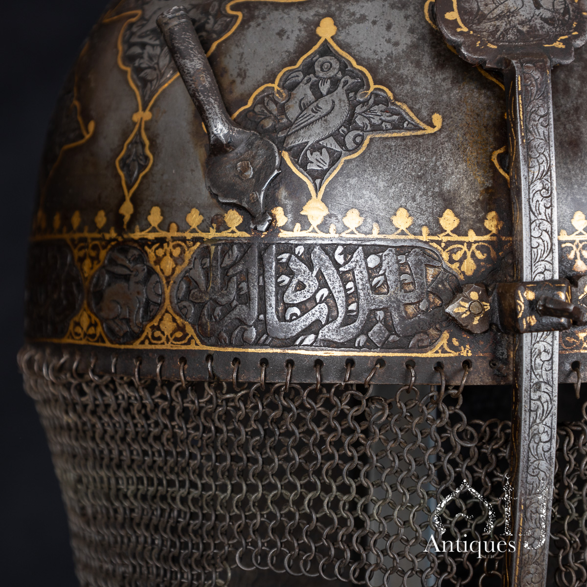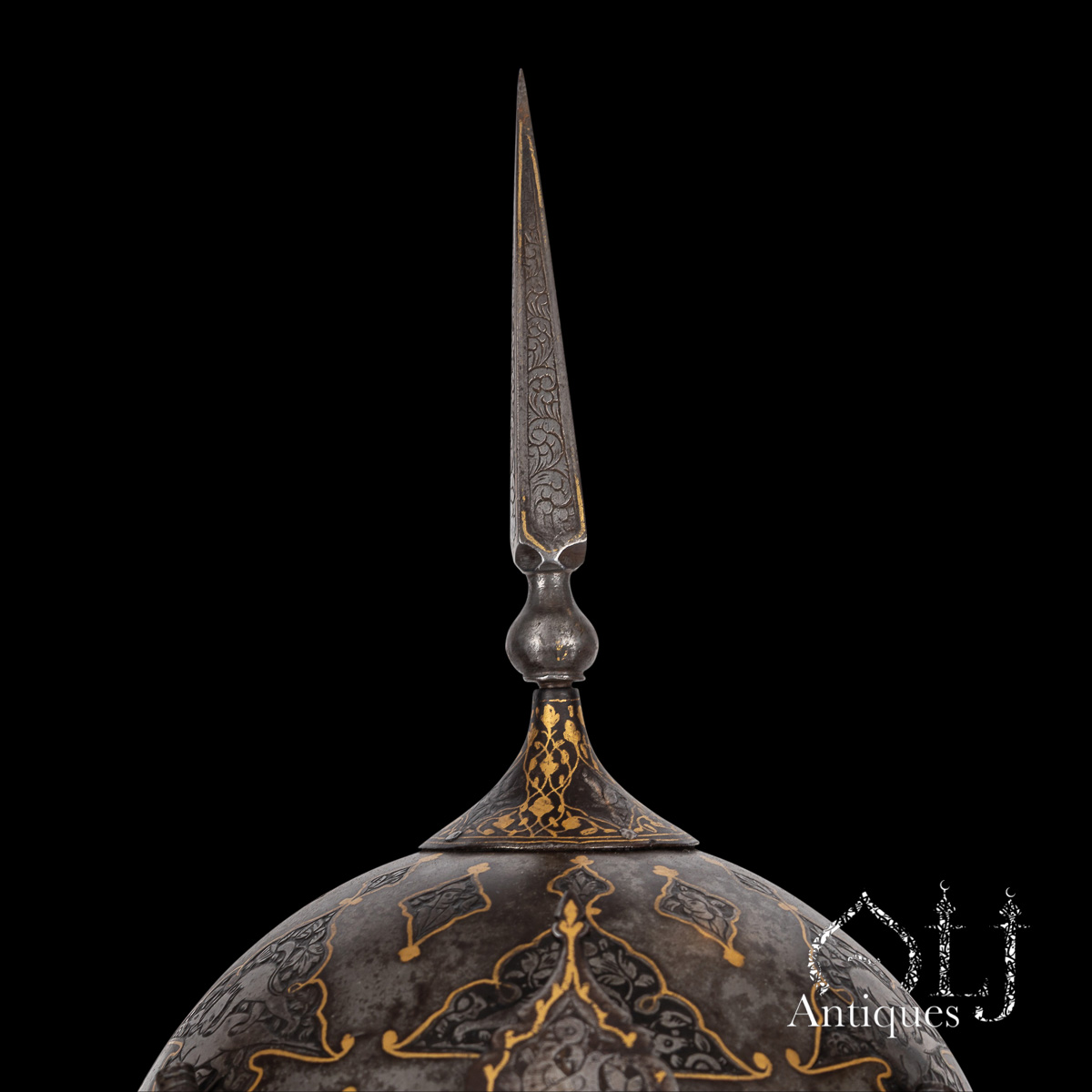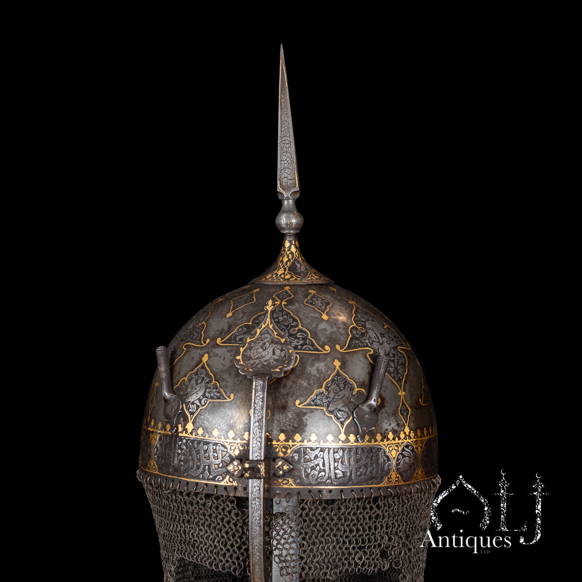 The helmet is of traditional domed form surmounted by a tall spike finial and fitted with a sliding nasal guard terminating in a palmette-shaped plaque. The helmet retains its original butted chainmail aventail, protecting the neck and shoulders. The steel surface is intricately engraved with medallions and cartouches depicting hunting animals and ornamental foliage, all highlighted with finely applied gold damascening.