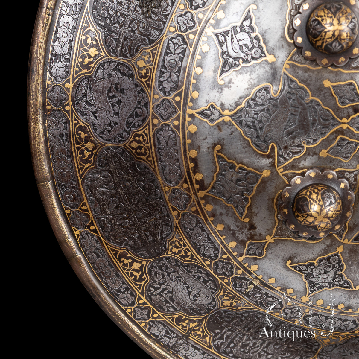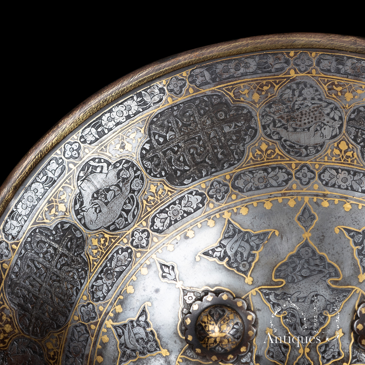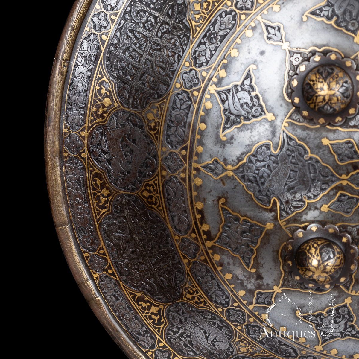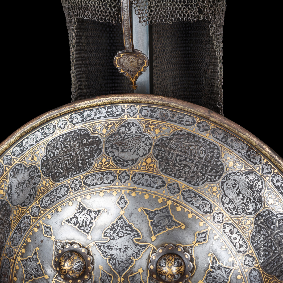 The accompanying shield (separ or sipar)—a term used in Persian sources for this convex shield form and often referred to in arms-and-armour literature as a dhal—is of circular convex form fitted with four applied bosses arranged symmetrically around the centre. The shield face is elaborately decorated with engraved animal hunting scenes within cartouches, surrounded by scrolling floral ornament and calligraphic bands, all enhanced with fine gold damascened decoration across the entire surface. The interior retains its traditional red textile lining, together with fittings for suspension and arm straps.
