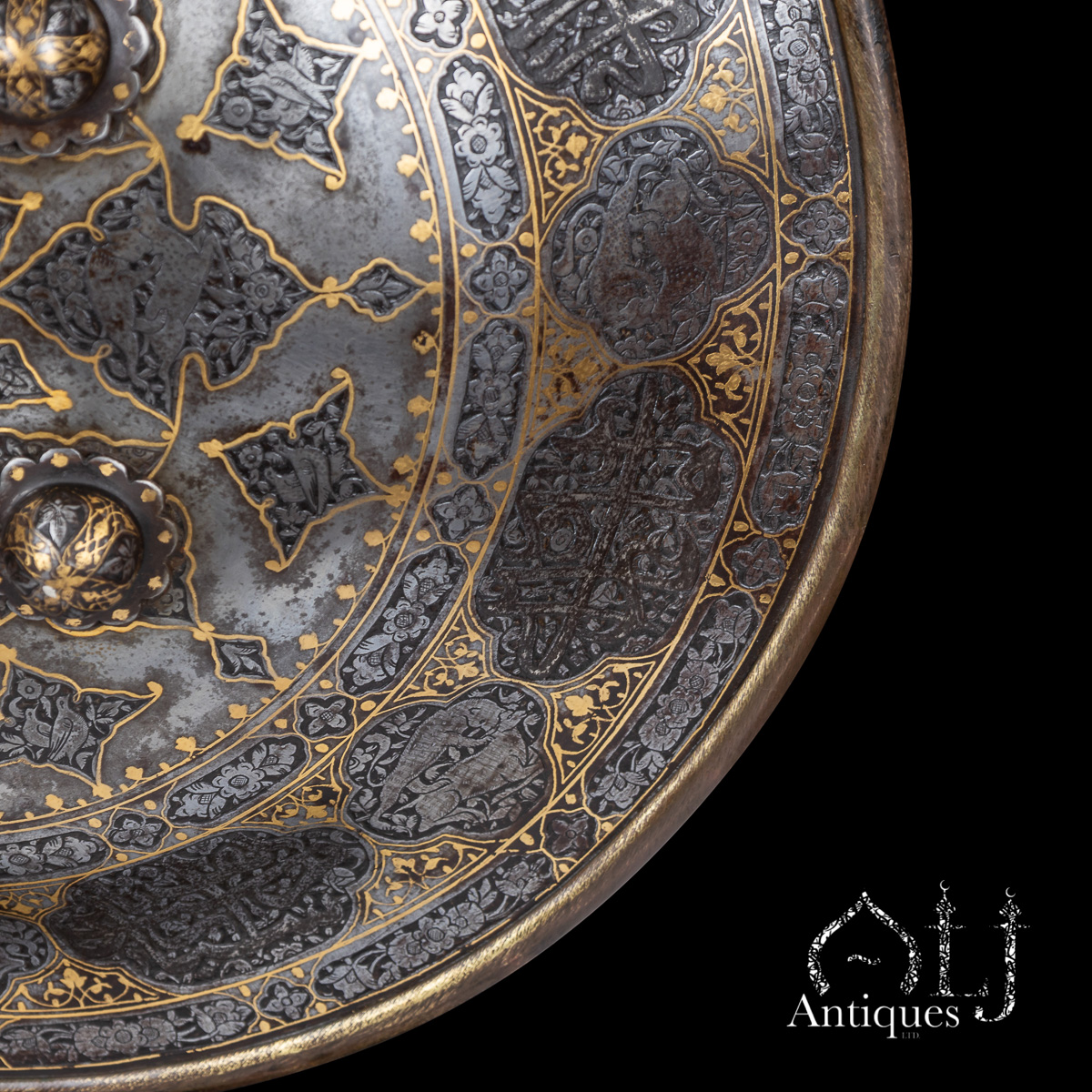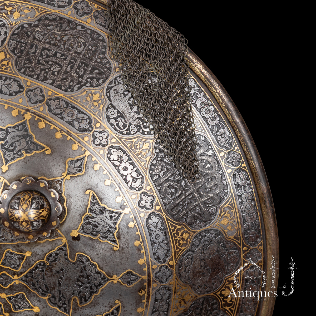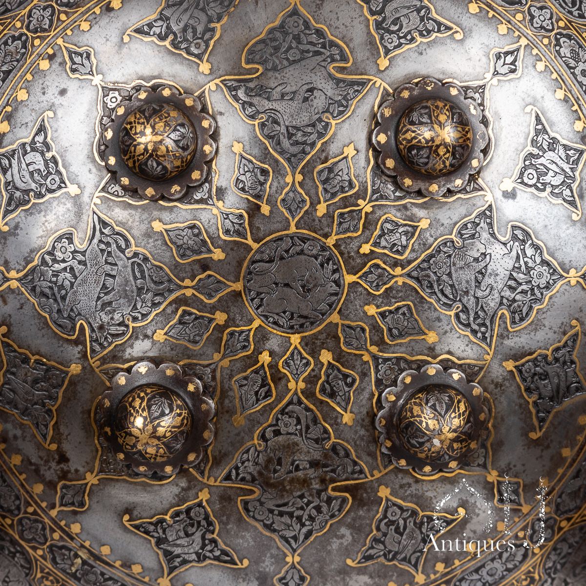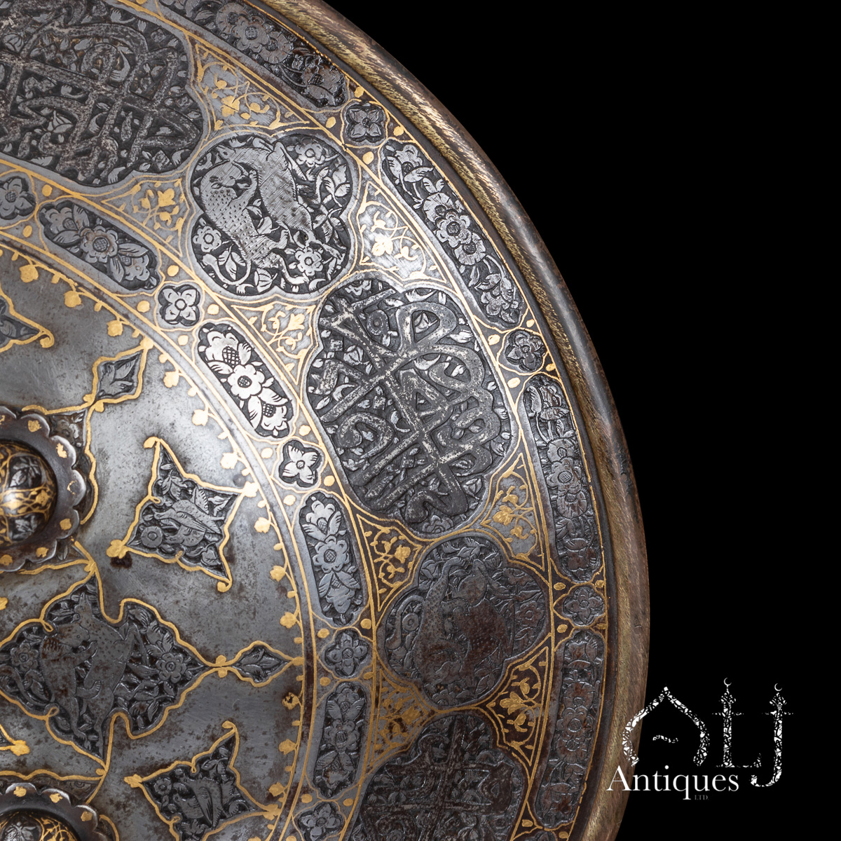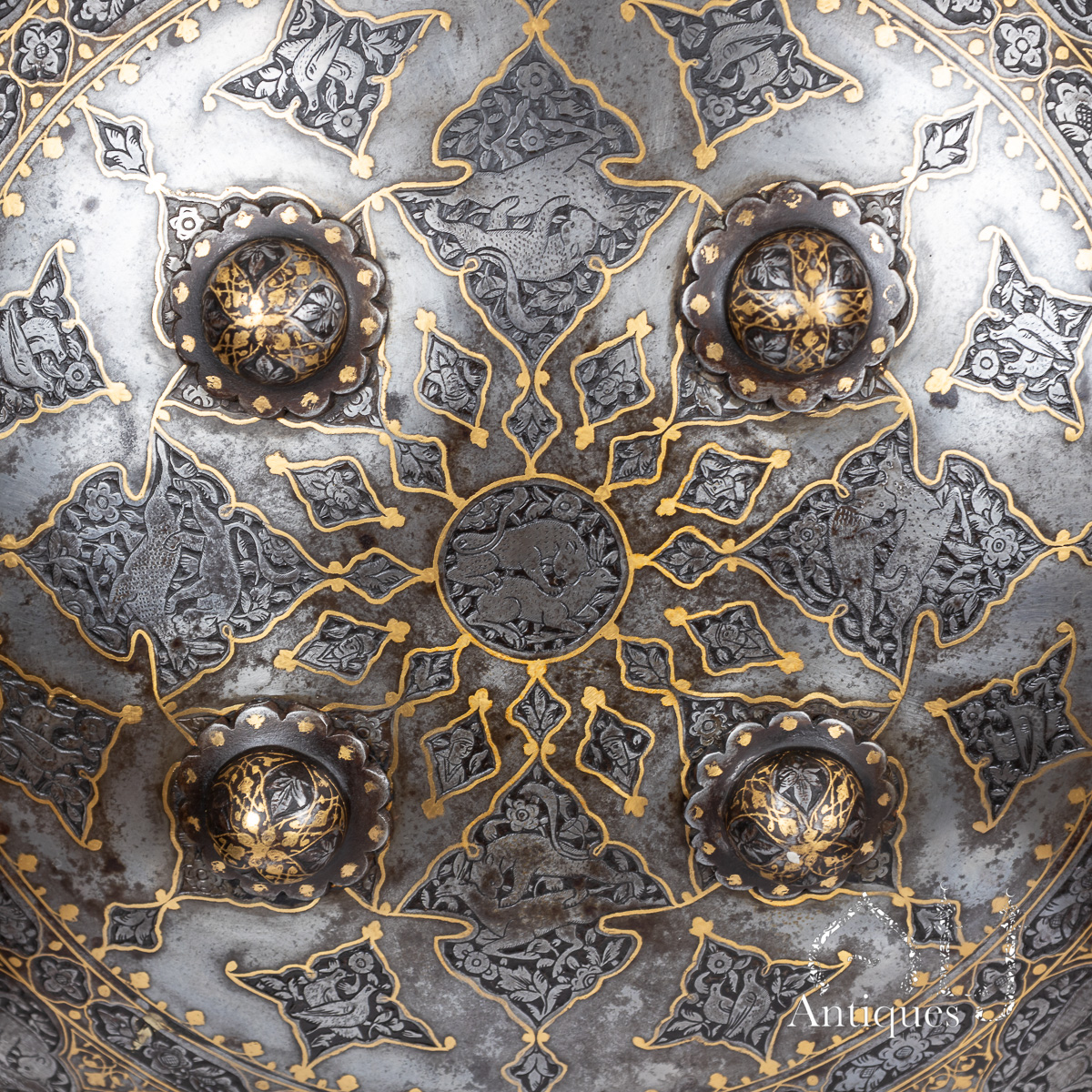 The accompanying shield (separ or sipar)—a term used in Persian sources for this convex shield form and often referred to in arms-and-armour literature as a dhal—is of circular convex form fitted with four applied bosses arranged symmetrically around the centre. The shield face is elaborately decorated with engraved animal hunting scenes within cartouches, surrounded by scrolling floral ornament and calligraphic bands, all enhanced with fine gold damascened decoration across the entire surface. The interior retains its traditional red textile lining, together with fittings for suspension and arm straps.