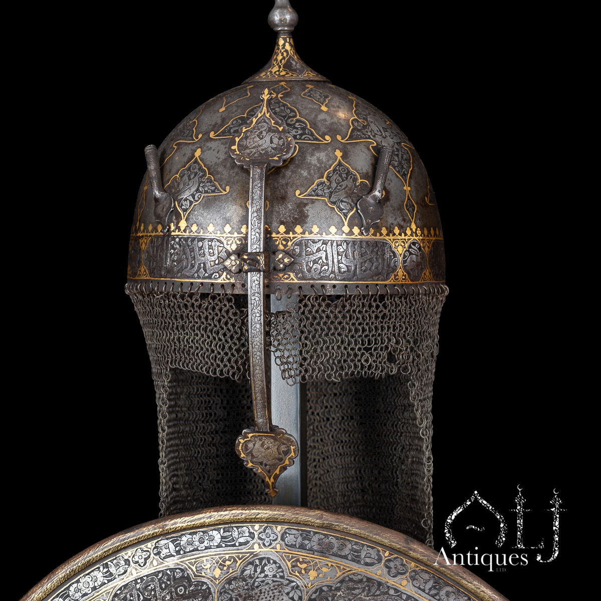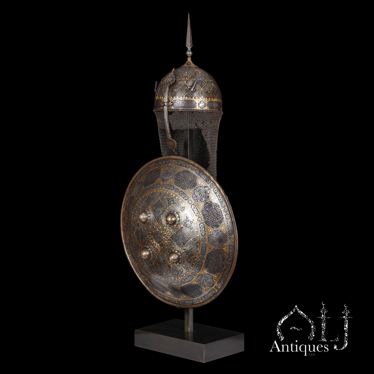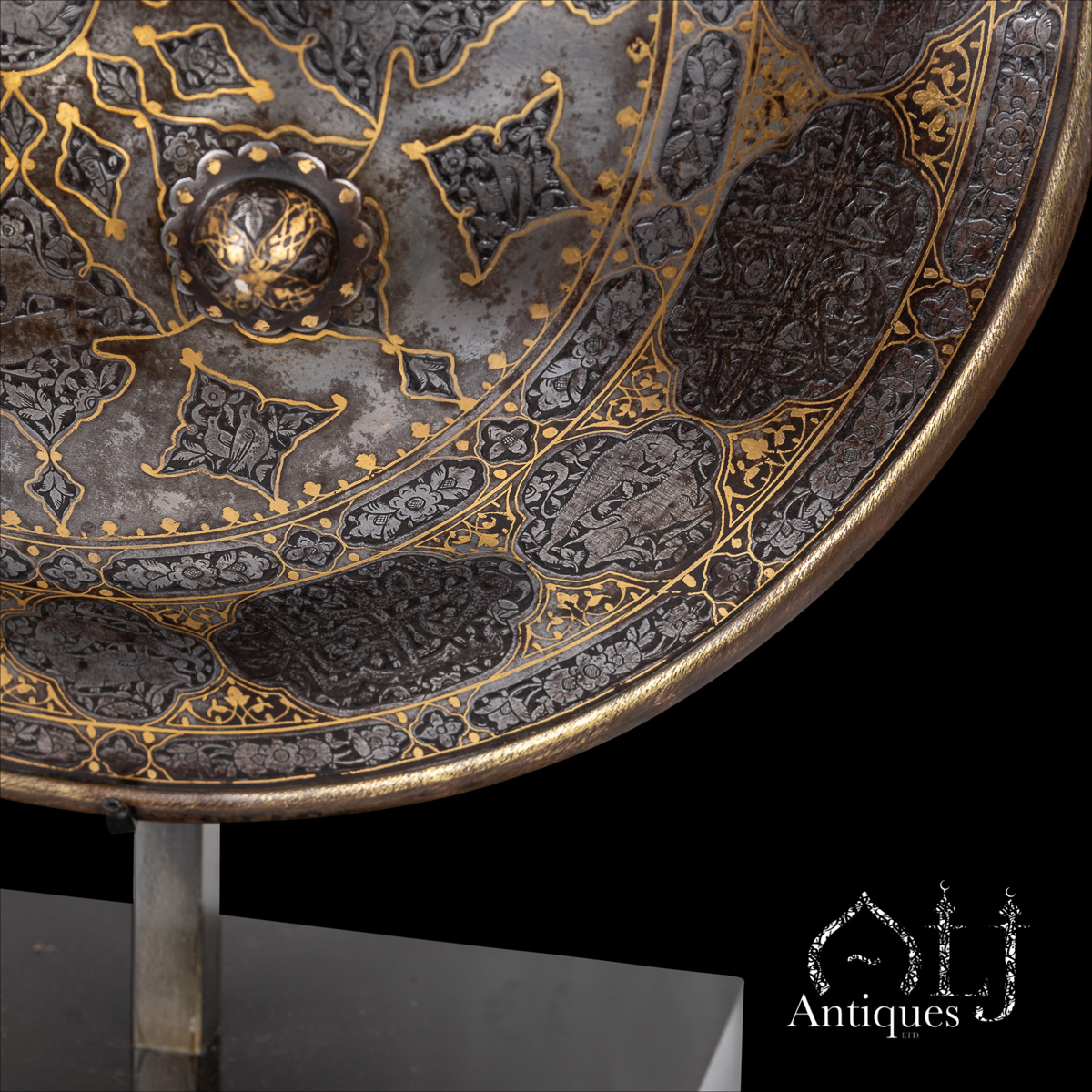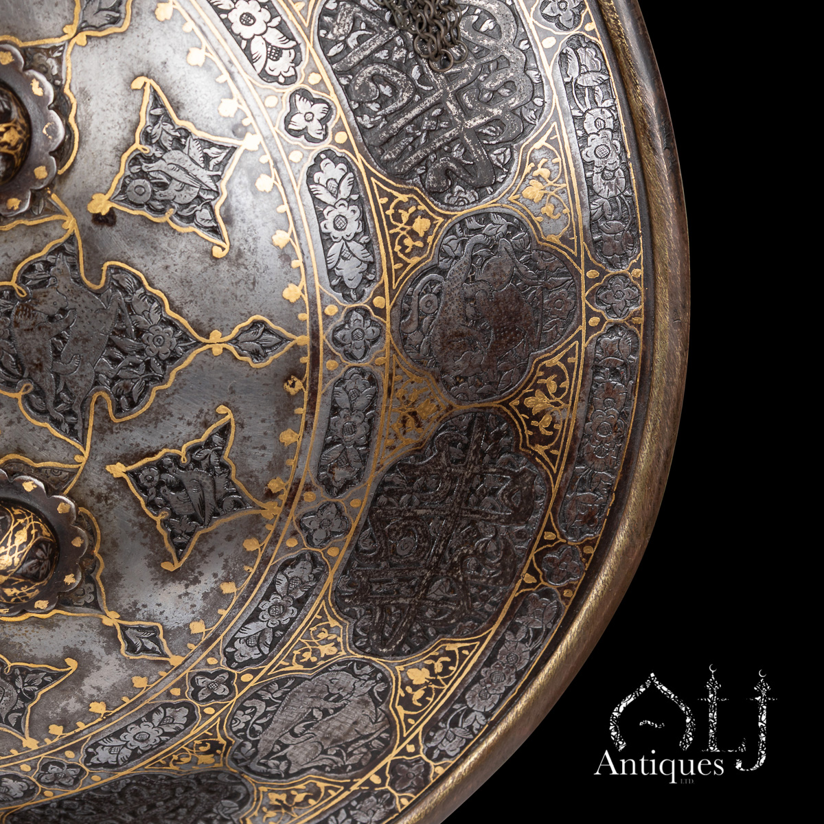 The accompanying shield (separ or sipar)—a term used in Persian sources for this convex shield form and often referred to in arms-and-armour literature as a dhal—is of circular convex form fitted with four applied bosses arranged symmetrically around the centre. The shield face is elaborately decorated with engraved animal hunting scenes within cartouches, surrounded by scrolling floral ornament and calligraphic bands, all enhanced with fine gold damascened decoration across the entire surface. The interior retains its traditional red textile lining, together with fittings for suspension and arm straps.