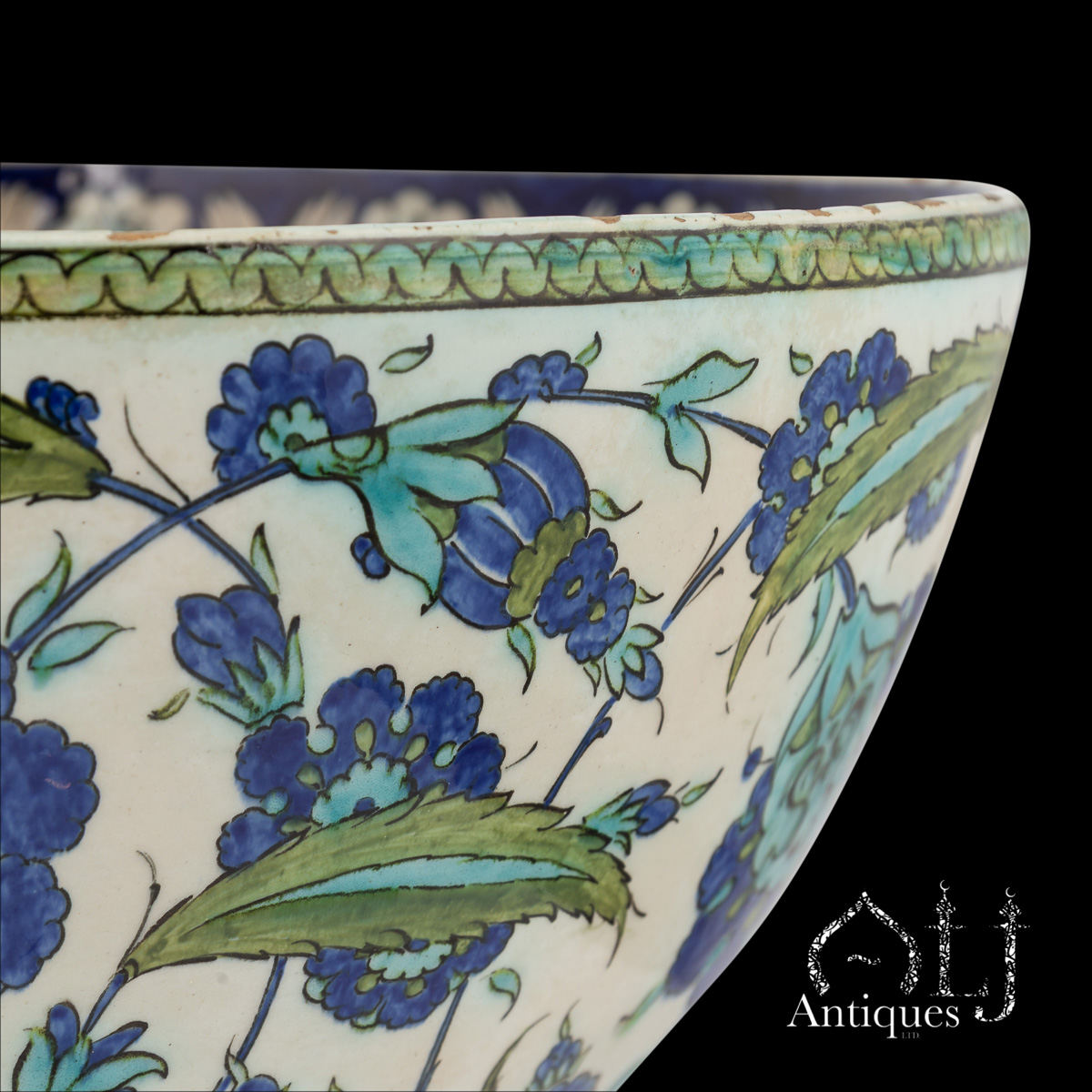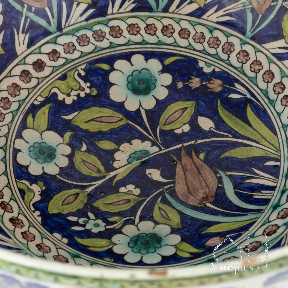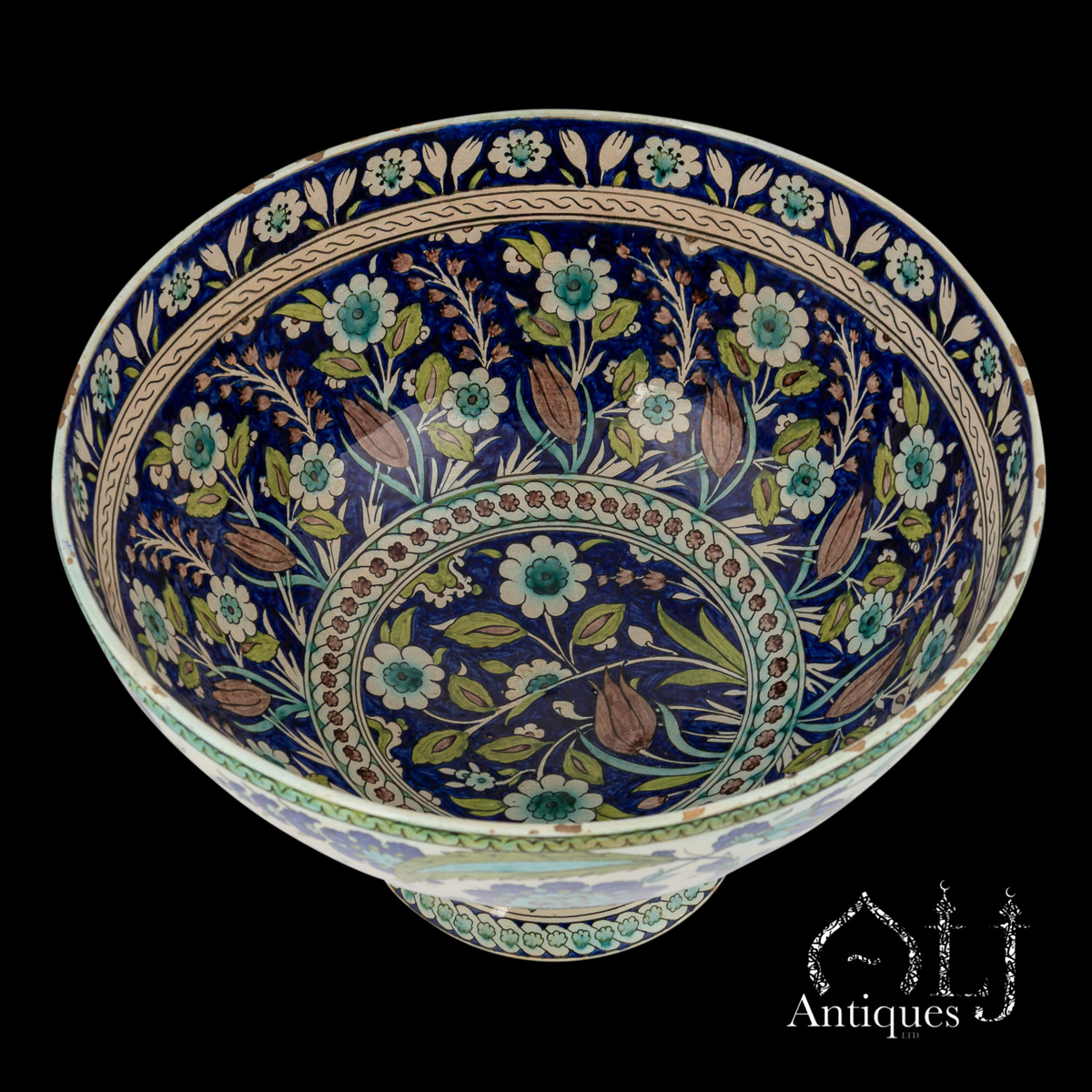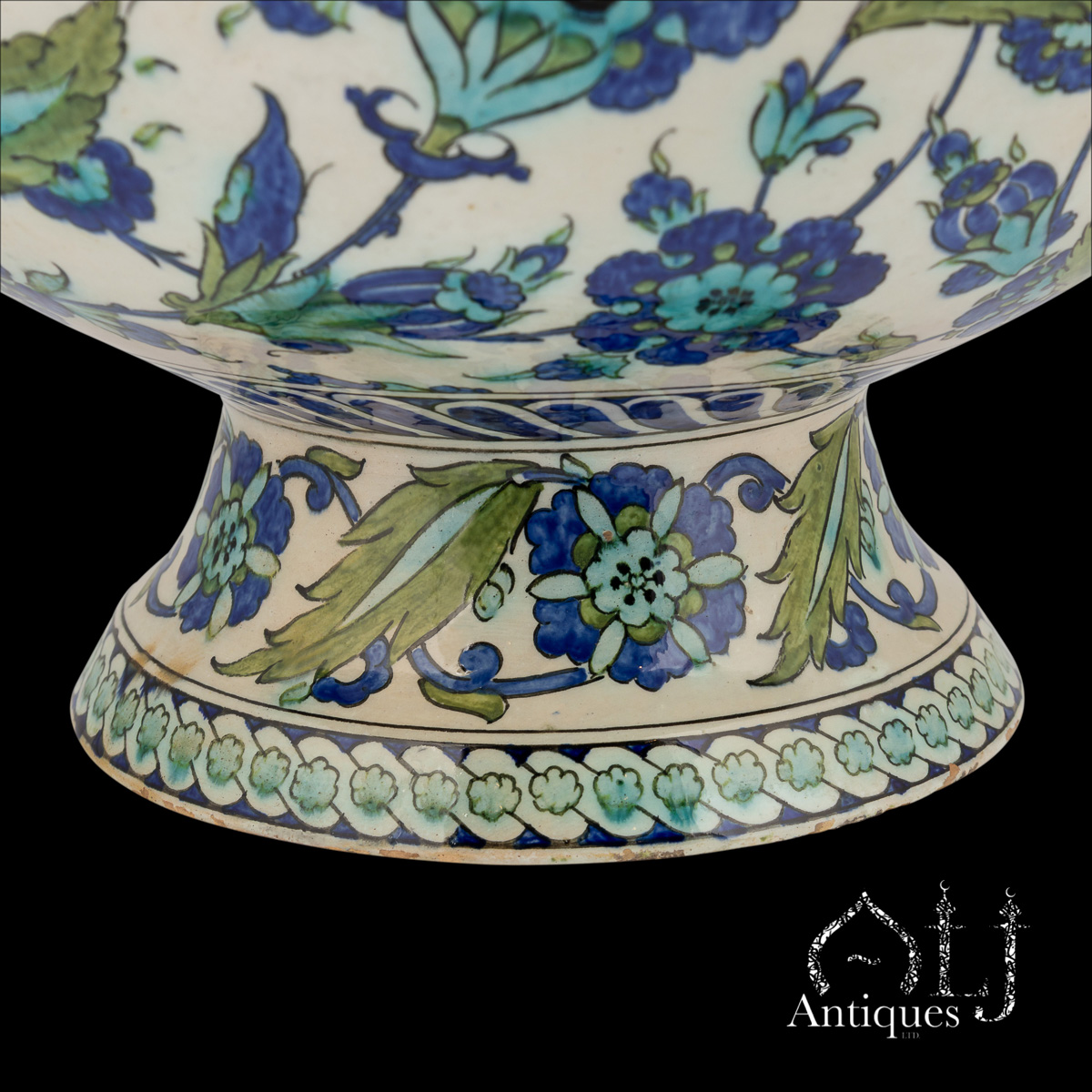An exceptionally rare and finely painted large Iznik “Damascus”-style faience footed basin by Ulisse Cantagalli, beautifully decorated under a transparent glaze in cobalt blue, turquoise, viridian green, and brick red, all outlined in fine black in the Ottoman Iznik manner.