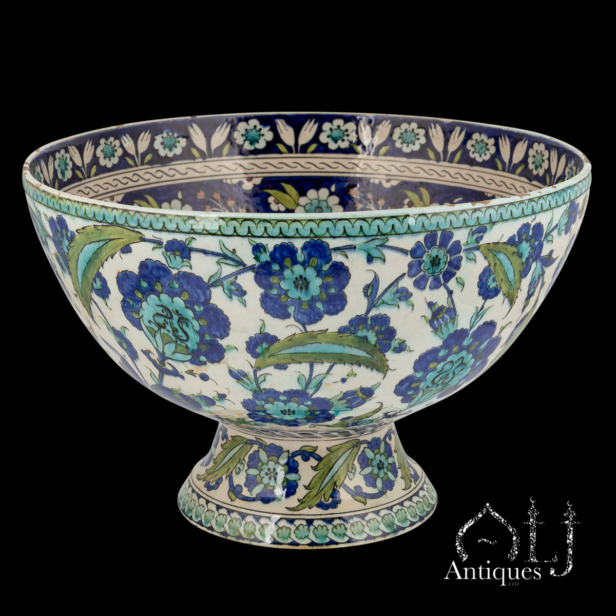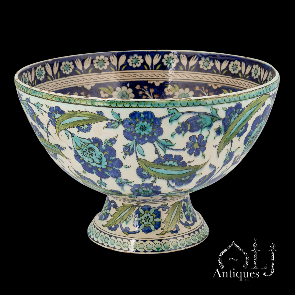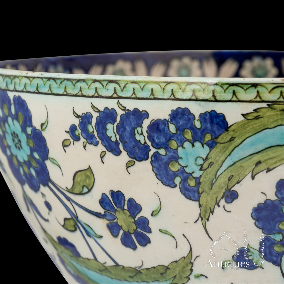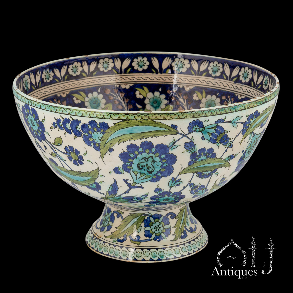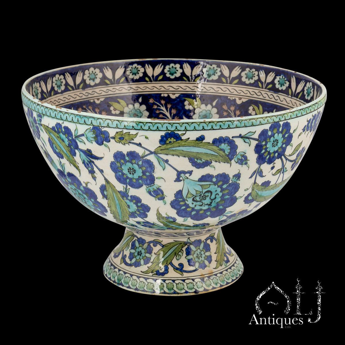 An exceptionally rare and finely painted large Iznik “Damascus”-style faience footed basin by Ulisse Cantagalli, beautifully decorated under a transparent glaze in cobalt blue, turquoise, viridian green, and brick red, all outlined in fine black in the Ottoman Iznik manner.