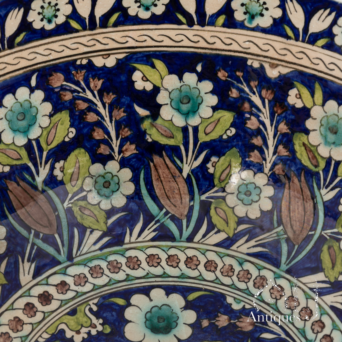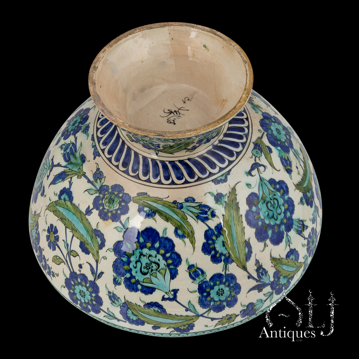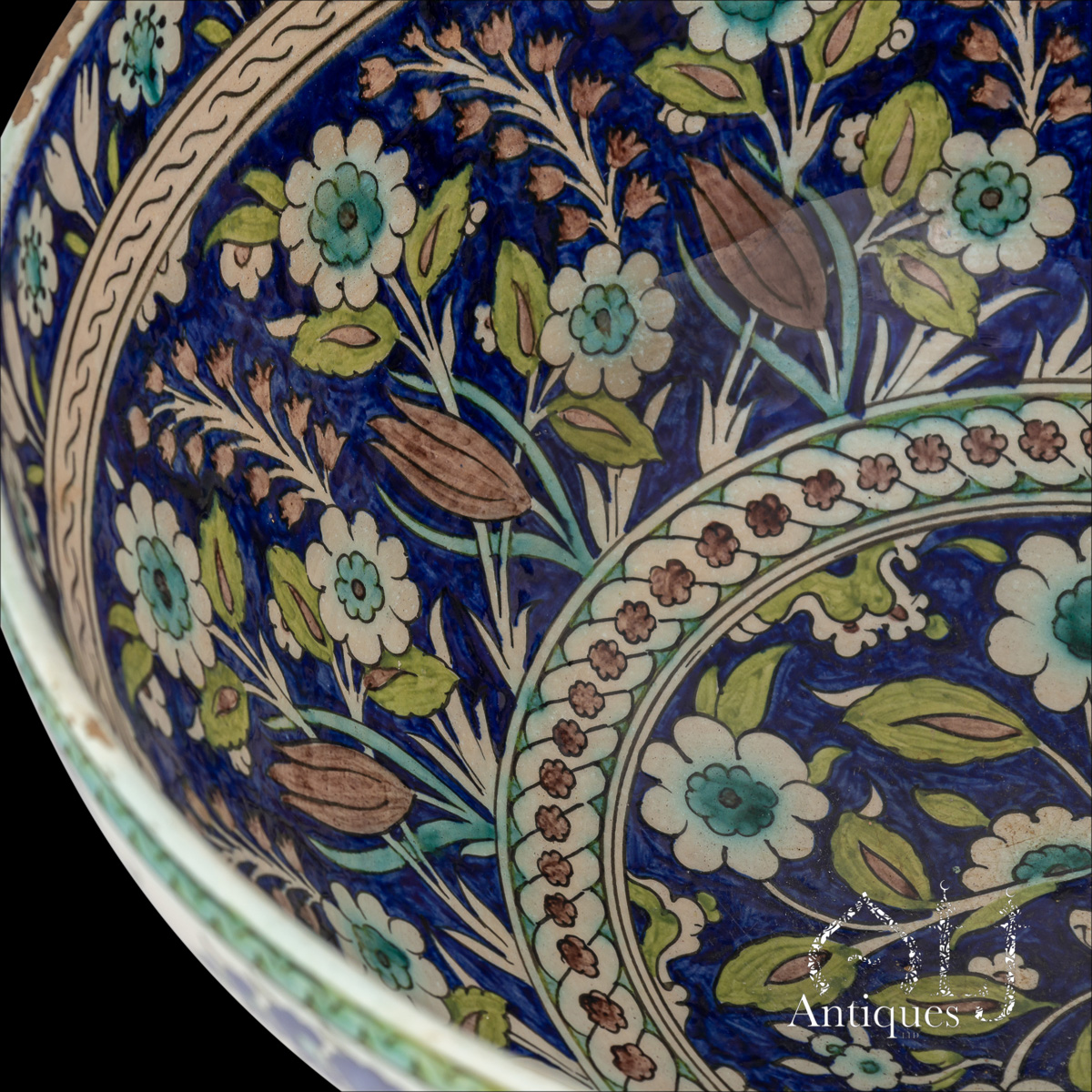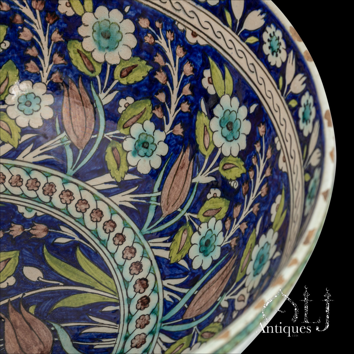 An exceptionally rare and finely painted large Iznik “Damascus”-style faience footed basin by Ulisse Cantagalli, beautifully decorated under a transparent glaze in cobalt blue, turquoise, viridian green, and brick red, all outlined in fine black in the Ottoman Iznik manner.