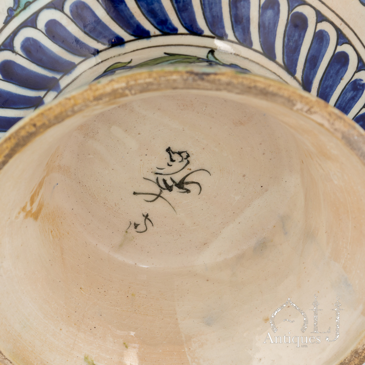 The large lotus and tulip palmettes on the exterior panels create a dynamic counterpoint to the more delicate interior, while the key-fret border at the base reflects Cantagalli’s synthesis of Islamic ornament and Renaissance geometry.