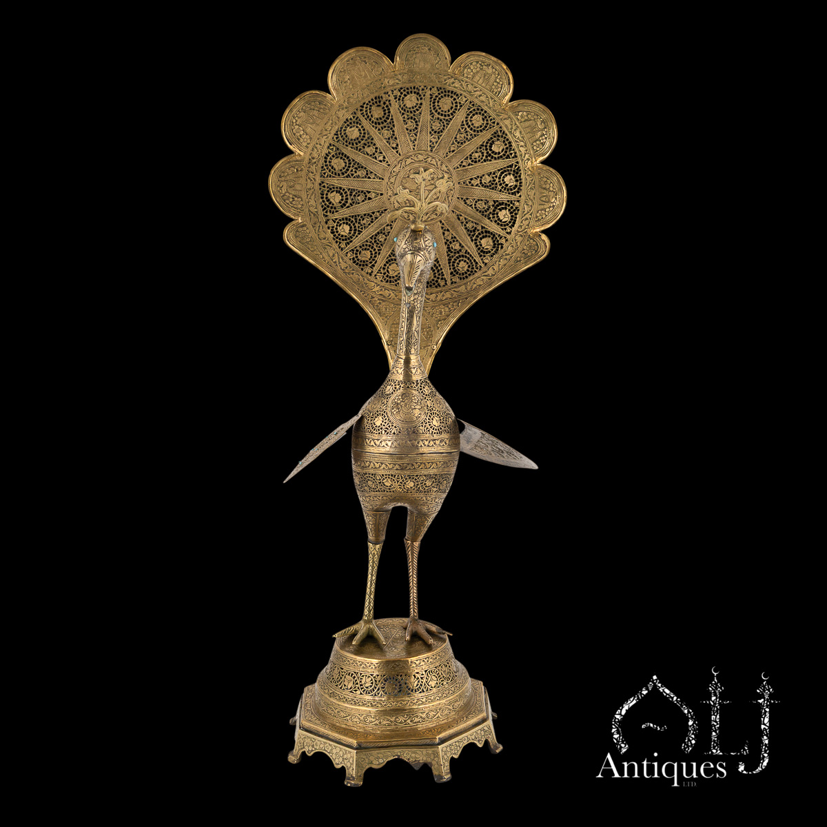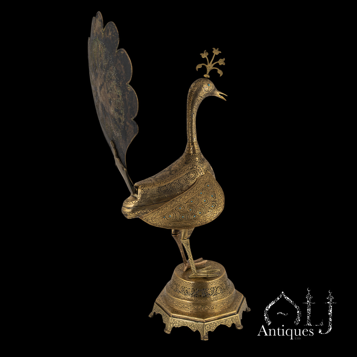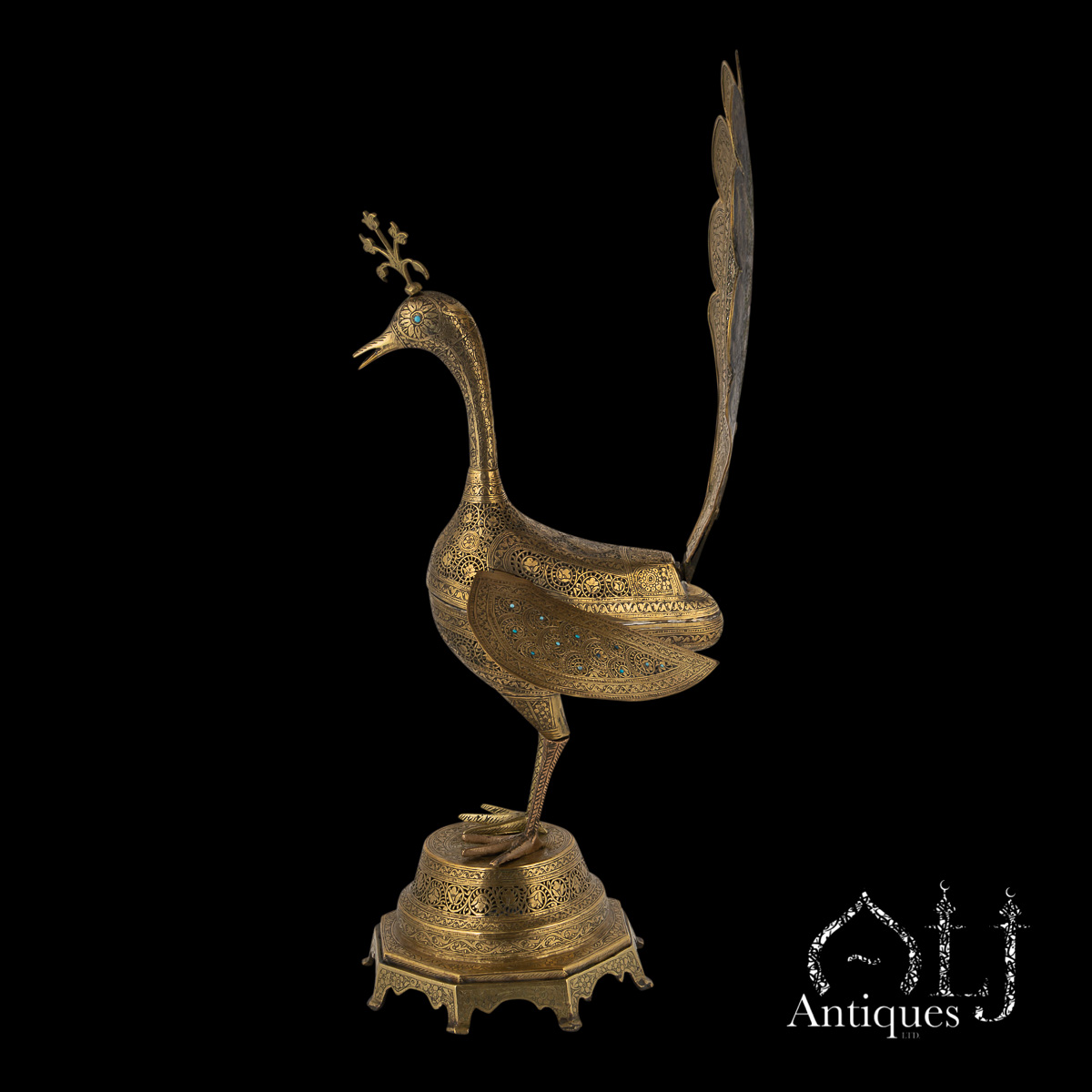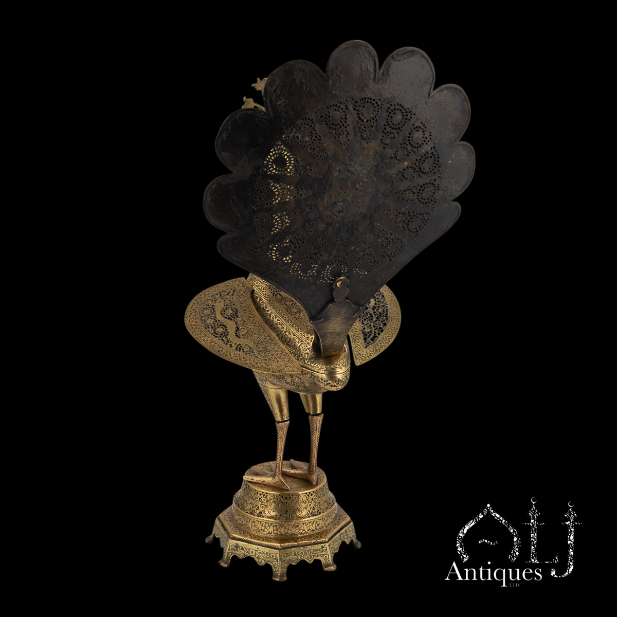 The peacocks stand on finely worked octagonal bases supported by eight elegant legs. The bodies are designed to open at the centre, revealing a compartment intended for burning incense, when in use allowing perfumed smoke to rise gracefully through the pierced floral patterns, producing a captivating interplay of light, scent, and form.