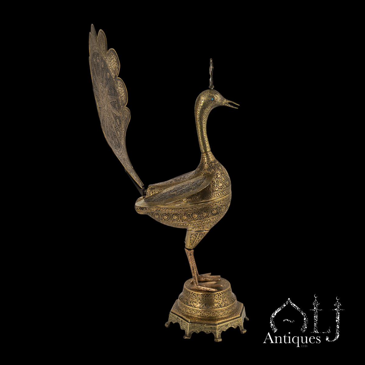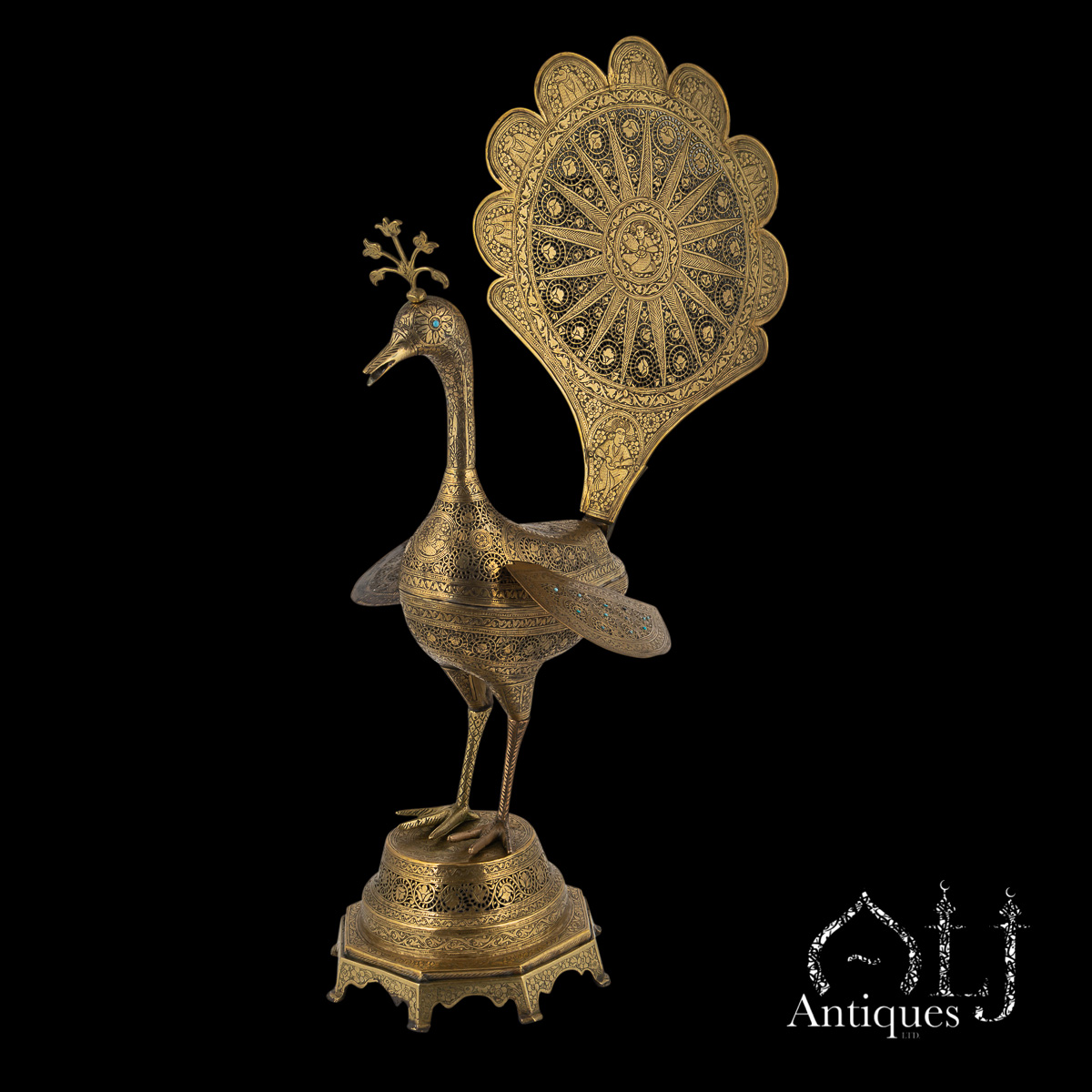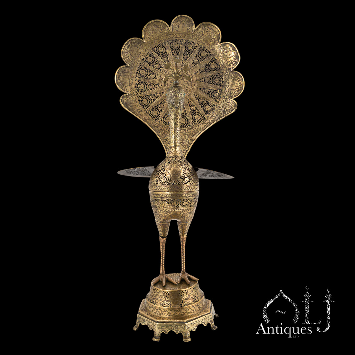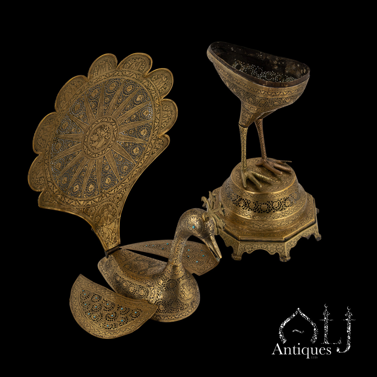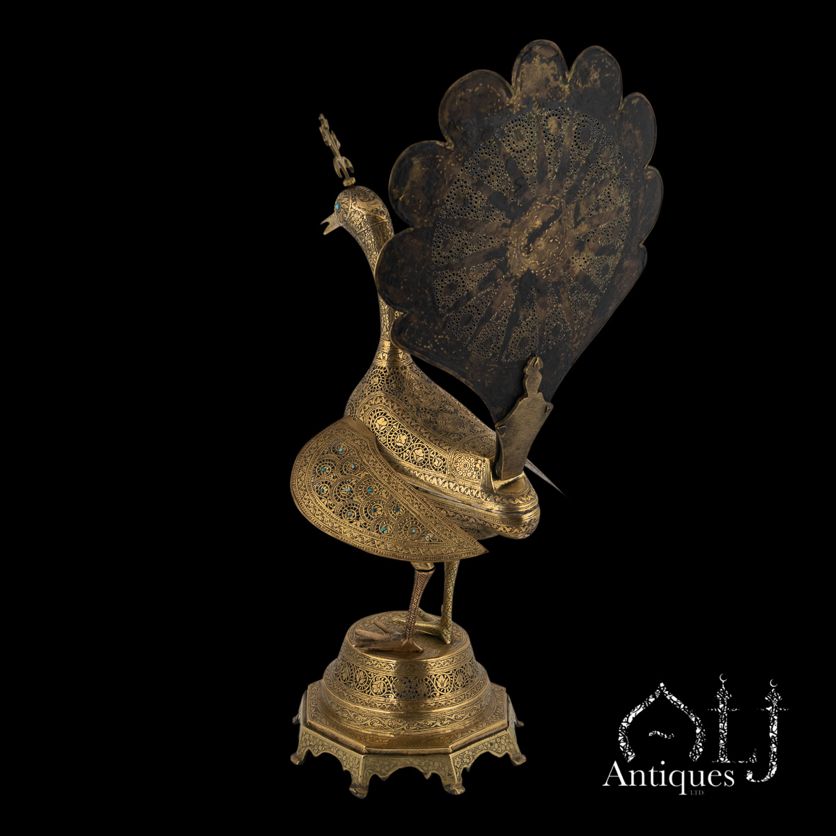 The peacocks stand on finely worked octagonal bases supported by eight elegant legs. The bodies are designed to open at the centre, revealing a compartment intended for burning incense, when in use allowing perfumed smoke to rise gracefully through the pierced floral patterns, producing a captivating interplay of light, scent, and form.