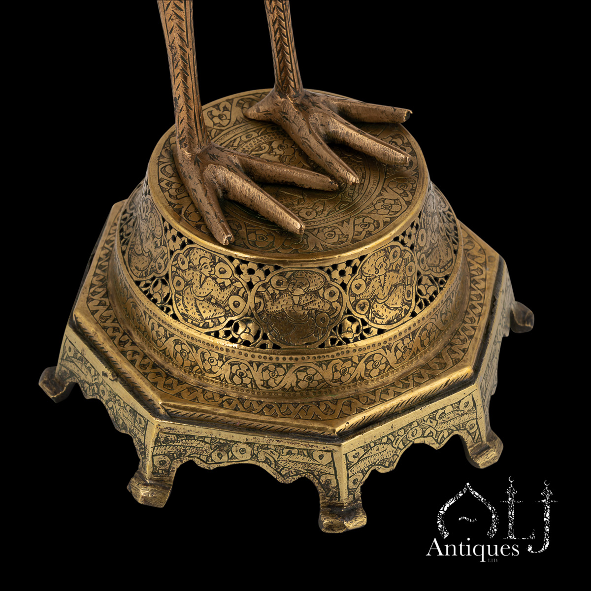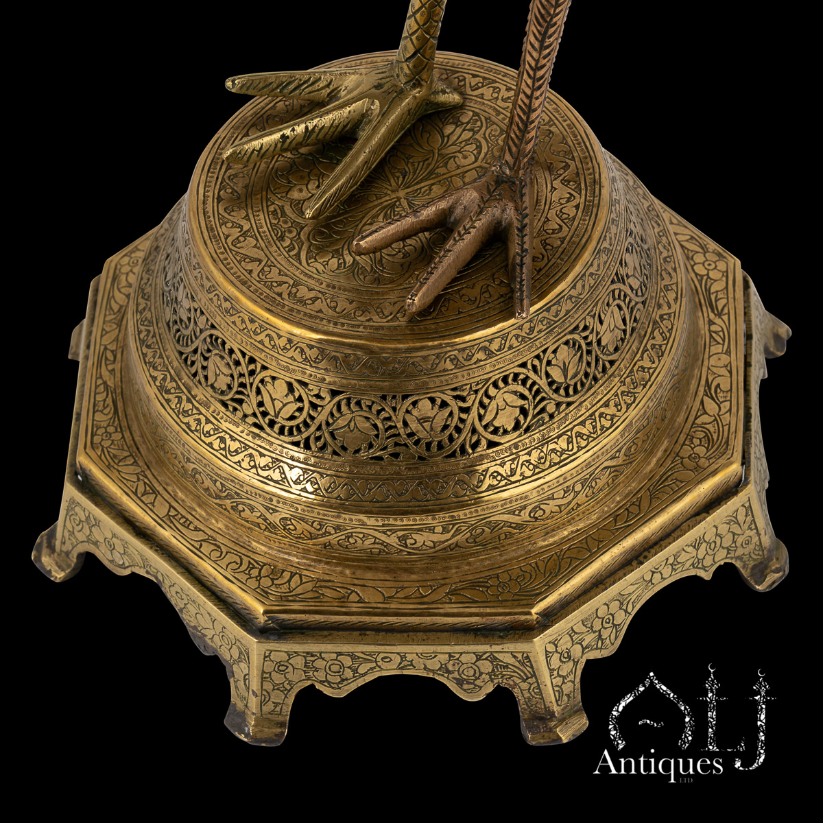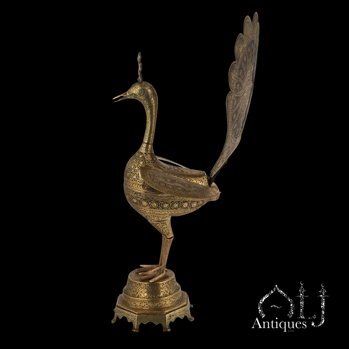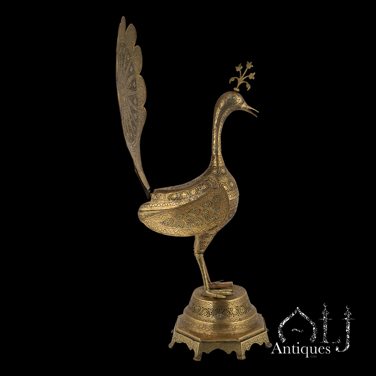 The peacocks stand on finely worked octagonal bases supported by eight elegant legs. The bodies are designed to open at the centre, revealing a compartment intended for burning incense, when in use allowing perfumed smoke to rise gracefully through the pierced floral patterns, producing a captivating interplay of light, scent, and form.