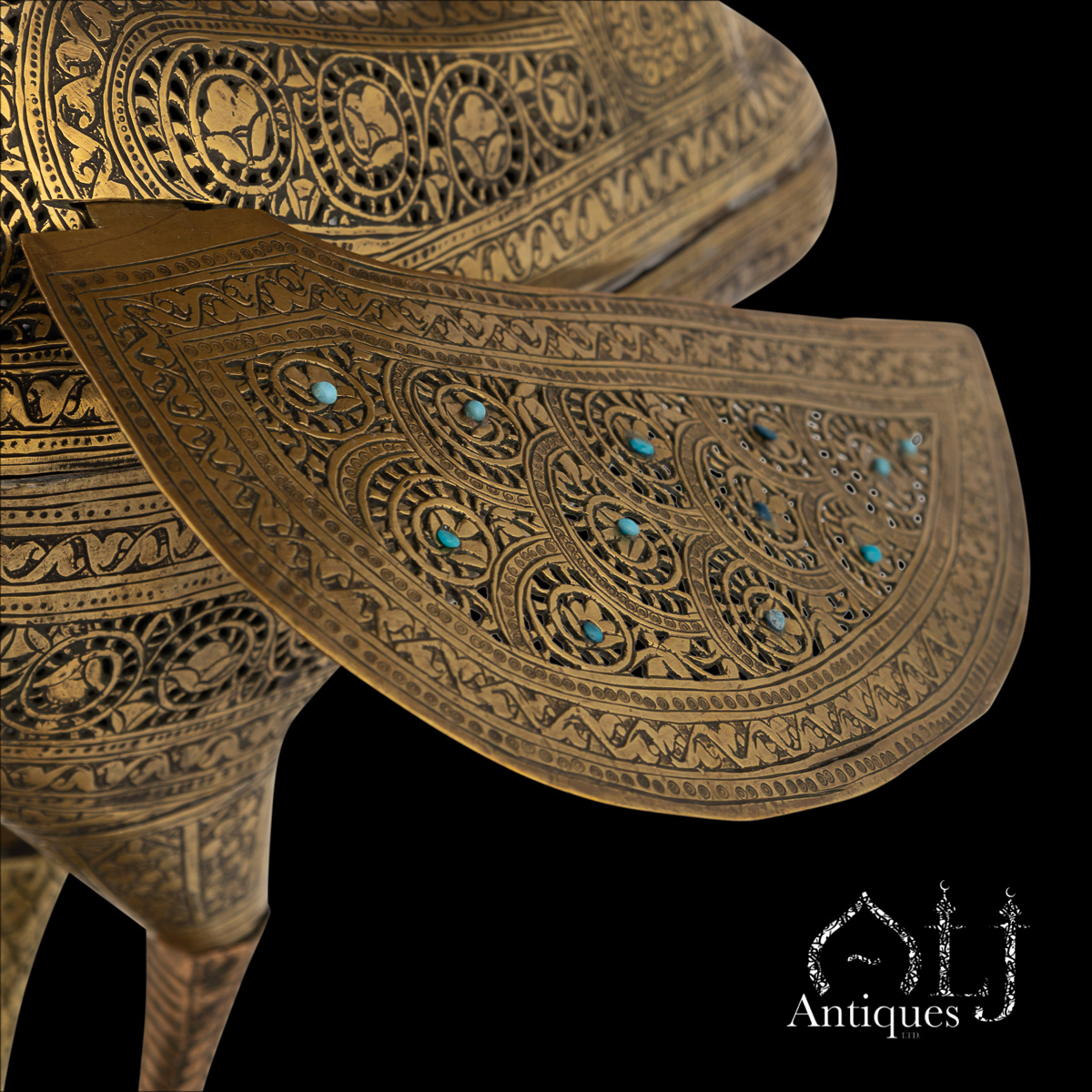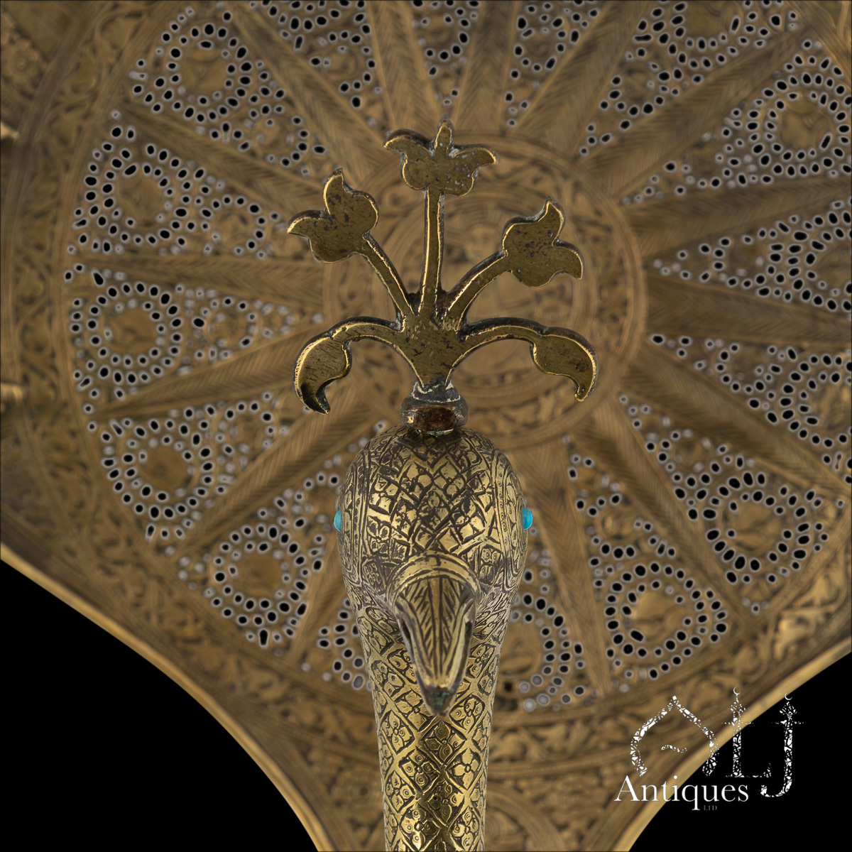 This remarkable pair of Zand Dynasty style hollow brass with pierced decoration and set with turquoise stone incense burners, crafted in the form of peacocks, dates to the Qajar period, 19th-century Iran. Each piece is exquisitely made from several individually constructed parts, demonstrating exceptional Persian craftsmanship and technical sophistication.