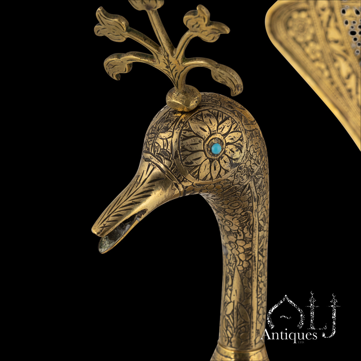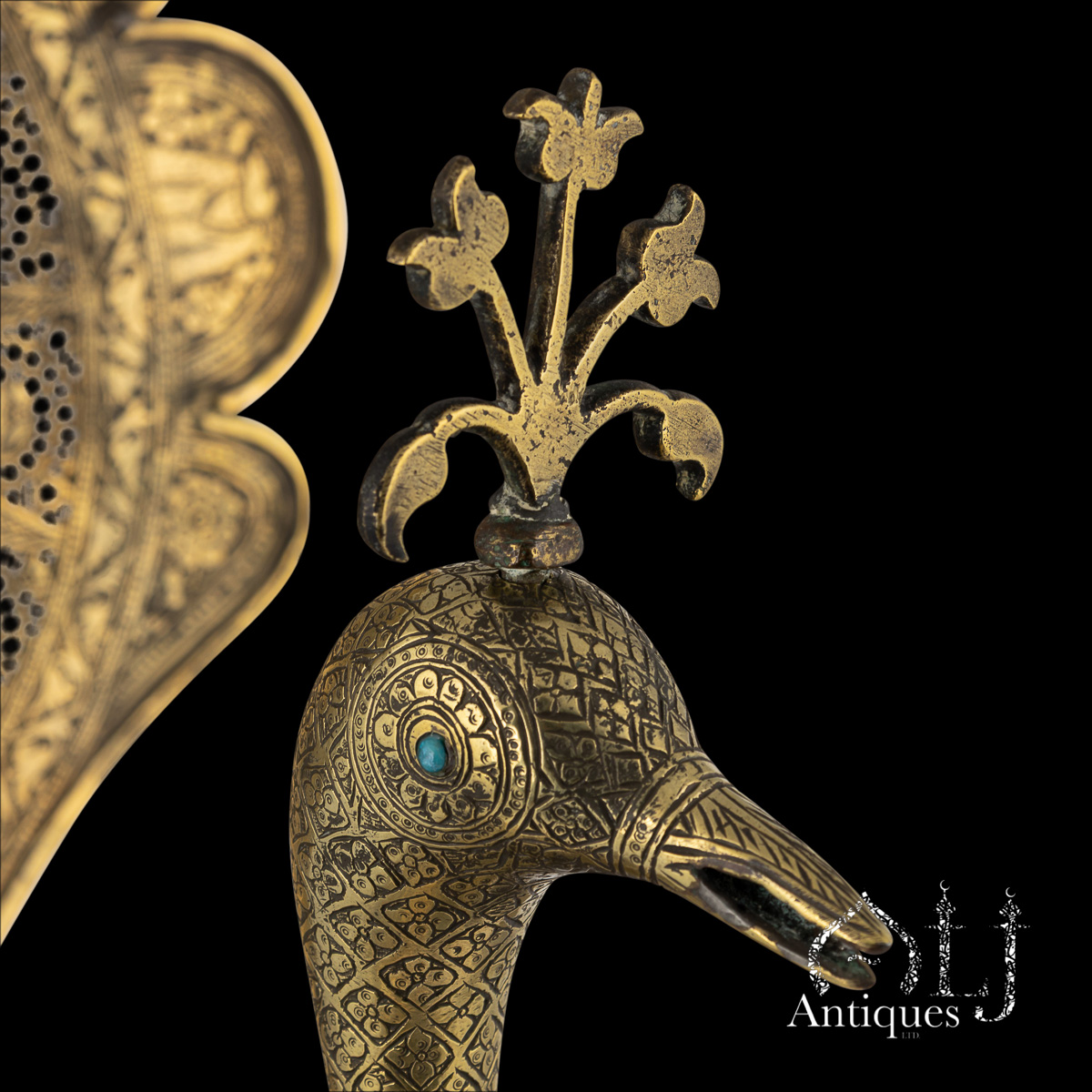 Each head is also individually made, crowned with a small finial that mirrors the peacock’s natural crest, the wings of the birds have some different type of decorations, one is engraved with snakes amidst floral decorations whereas the other one is decorated with floral openwork decorations and inset with turquoise stones, the eyes of both pairs are set with turquoise stones.