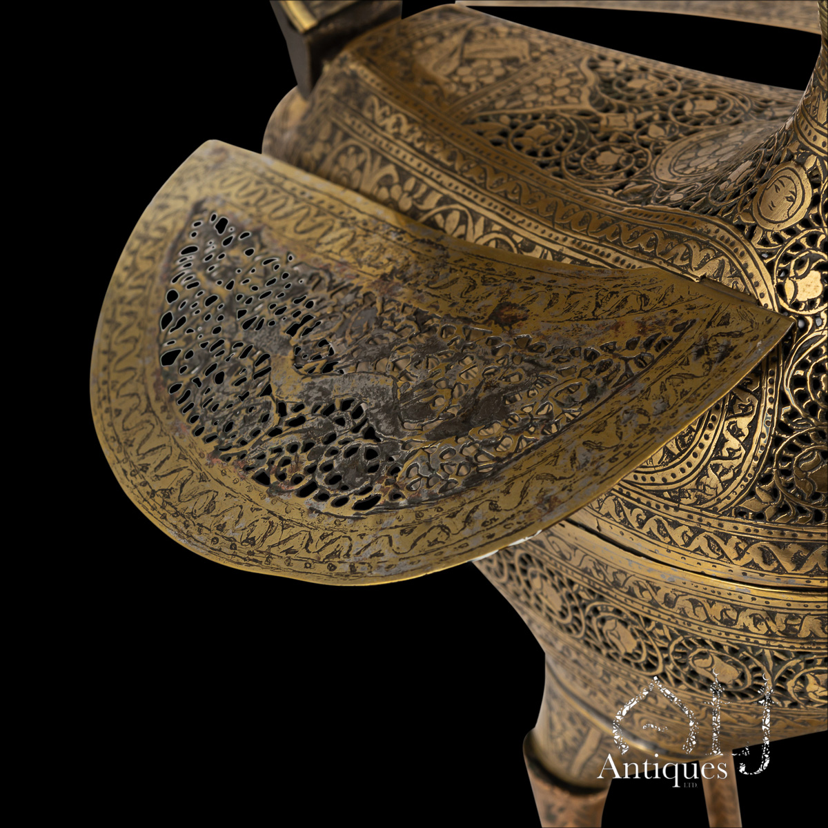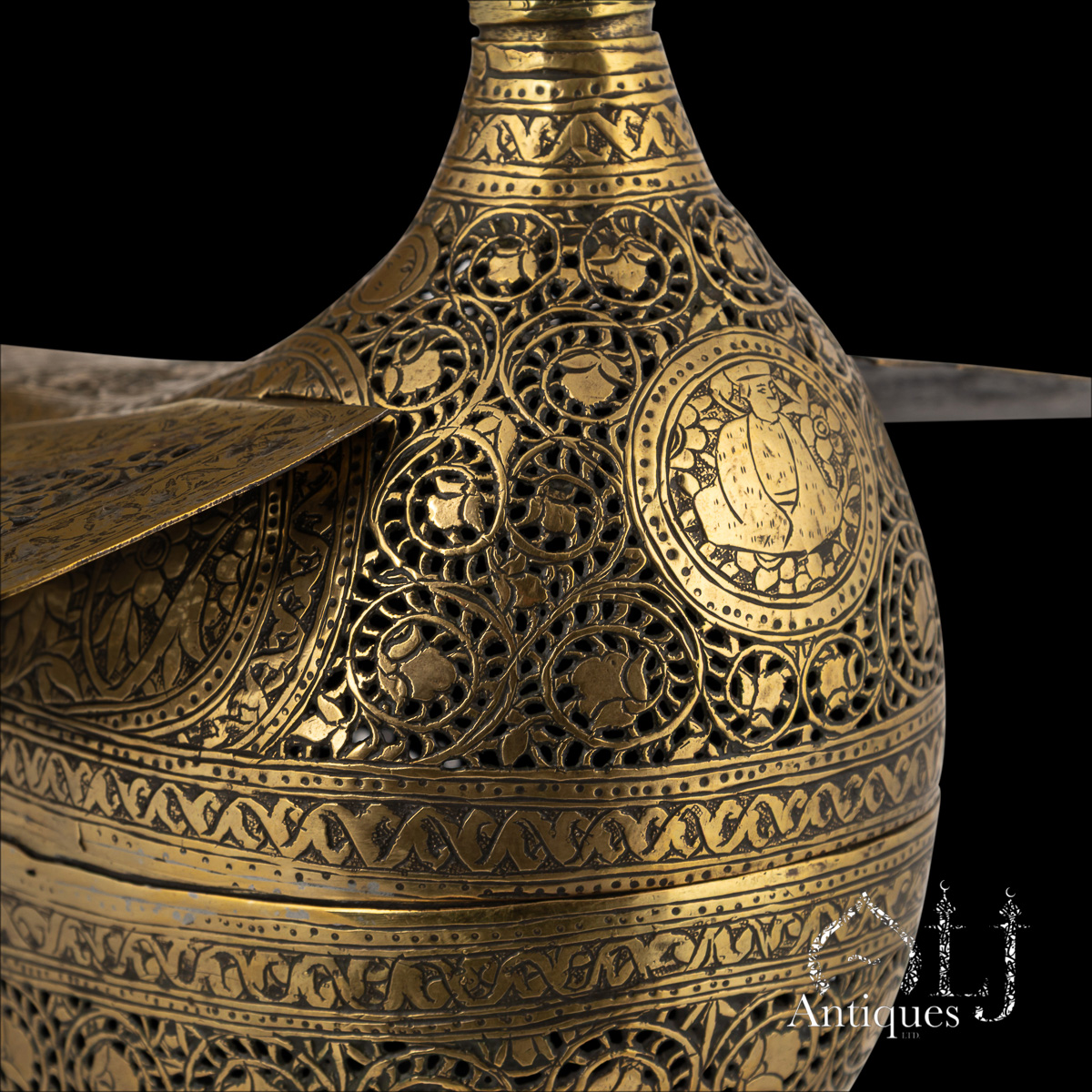 The pierced decoration throughout the body, wings, and tail features a continuous sequence of palmettes framed by intricate floral openwork designs. The engraved surfaces are richly adorned with human figures dressed in varied Persian garments, surrounded by stylised foliage and decorative motifs.