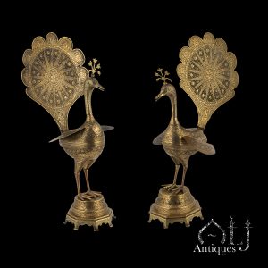 Zand Dynasty Style Pierced Brass Incense Burners in the Form of Peacocks, Partially Encrusted with Turquoise Stones – Qajar Dynasty, Possibly Isfahan-Iran, C. 1870s.